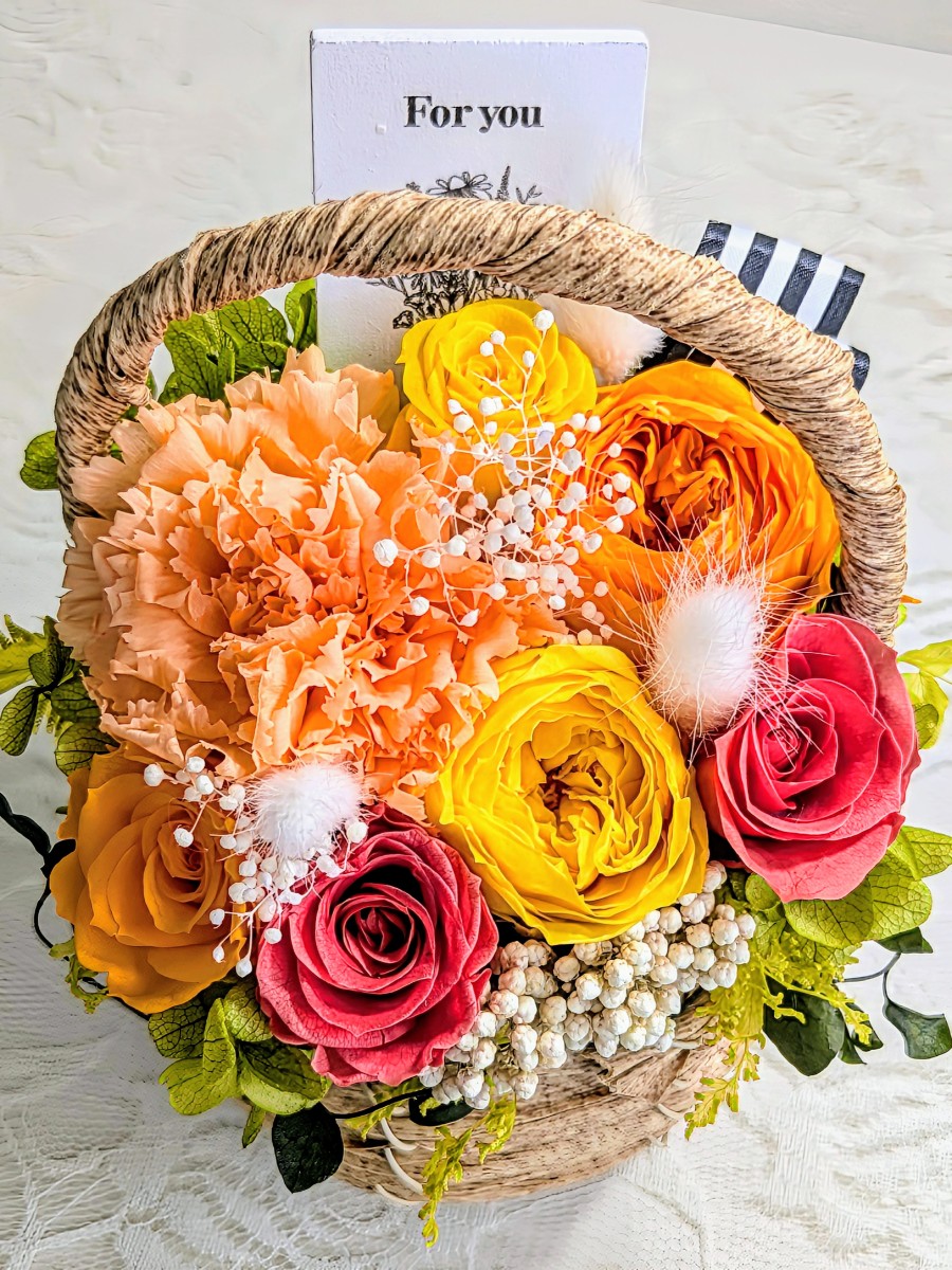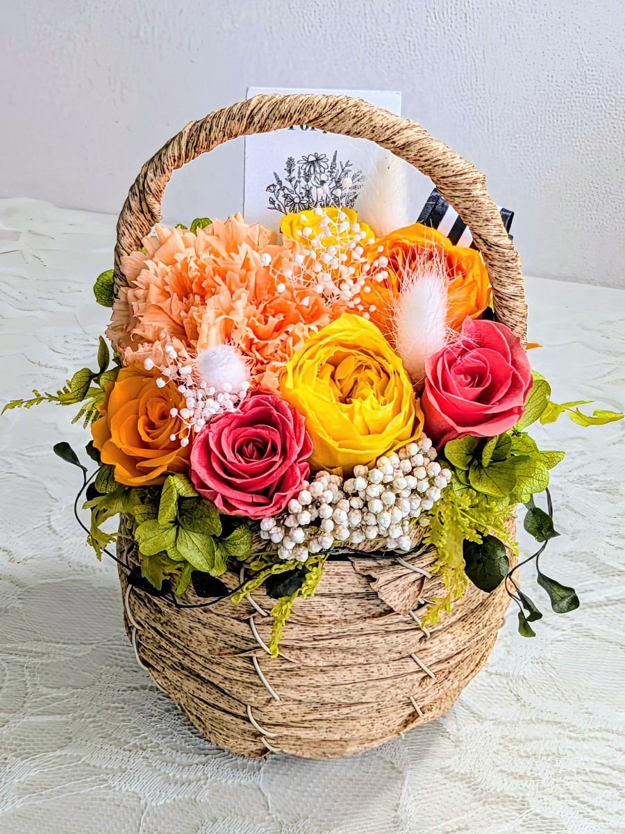 ローズやカーネーションを沢山使ったプリザーブドフラワー花籠バスケットアレンジです。