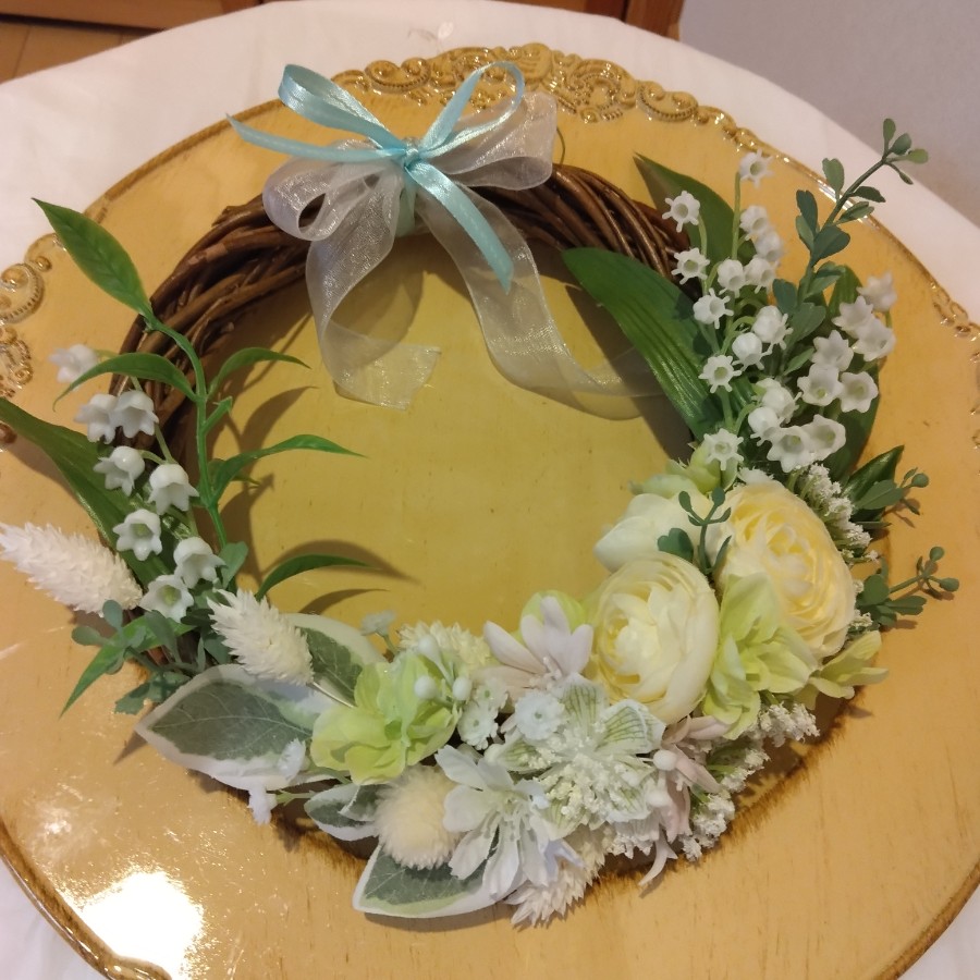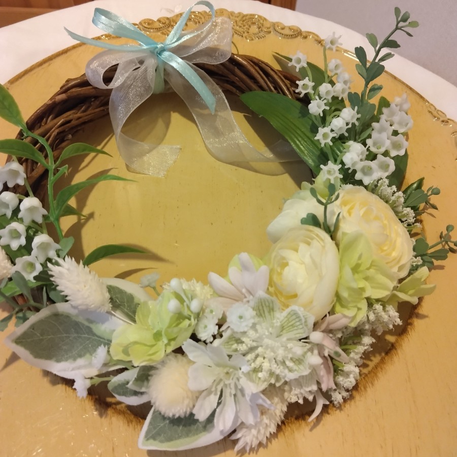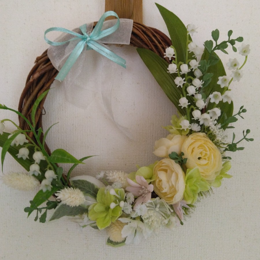 ラナンキュラス、白いスズラン、グリーンのアジサイなどのアーティフィシャルフラワーを使い、春から夏への移ろいを感じさせる作品です。柔らかく上品な色合いは、穏やかで清々しい雰囲気をお部屋に運びます。