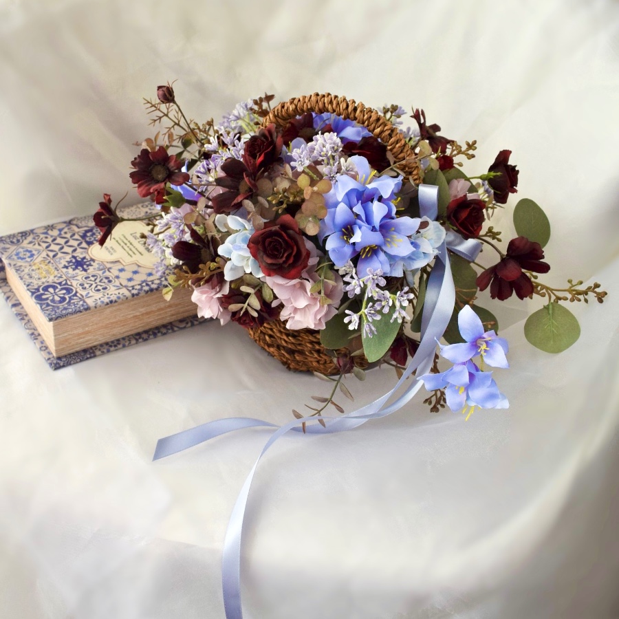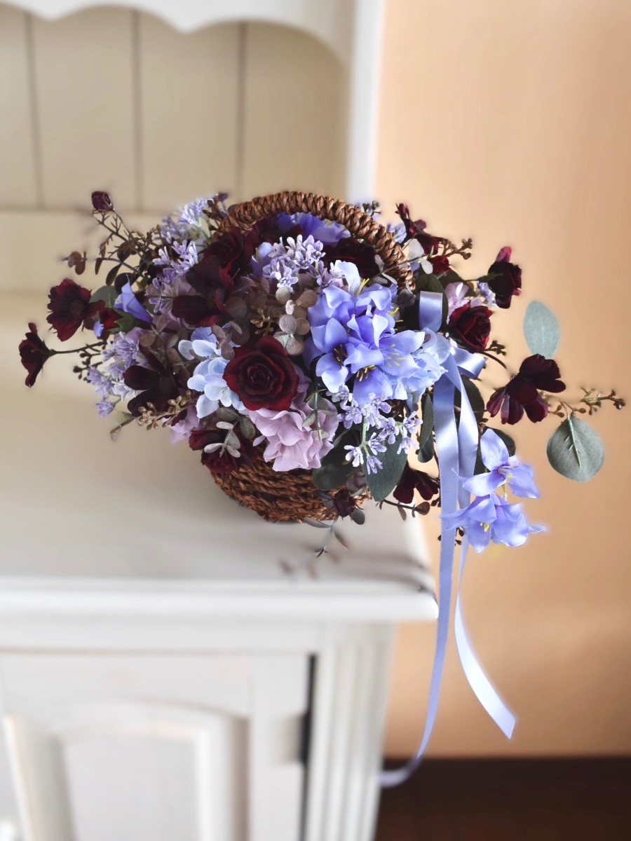 秋らしいアンダートーンの配色に鮮やかなブルーラベンダーの花が印象的なバスケットアレンジです。