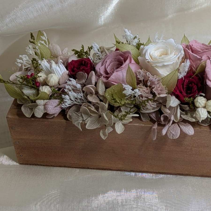 木製の花器にいれることで、ナチュラルな雰囲気になりました