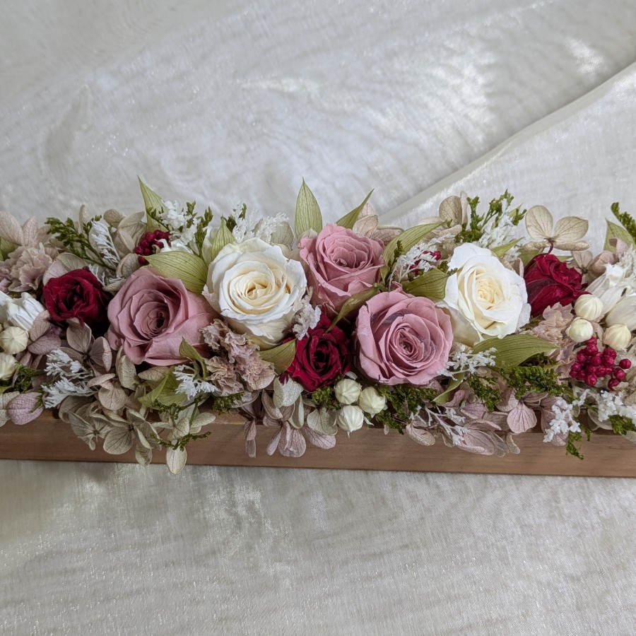 玄関に華々しくかざるというよりも、リビングや、廊下、食卓テーブルの上、寝室のドアなど、生活する中でふと目にした瞬間に優しい気持ちになれるようなさりげないお花飾りを目指しています