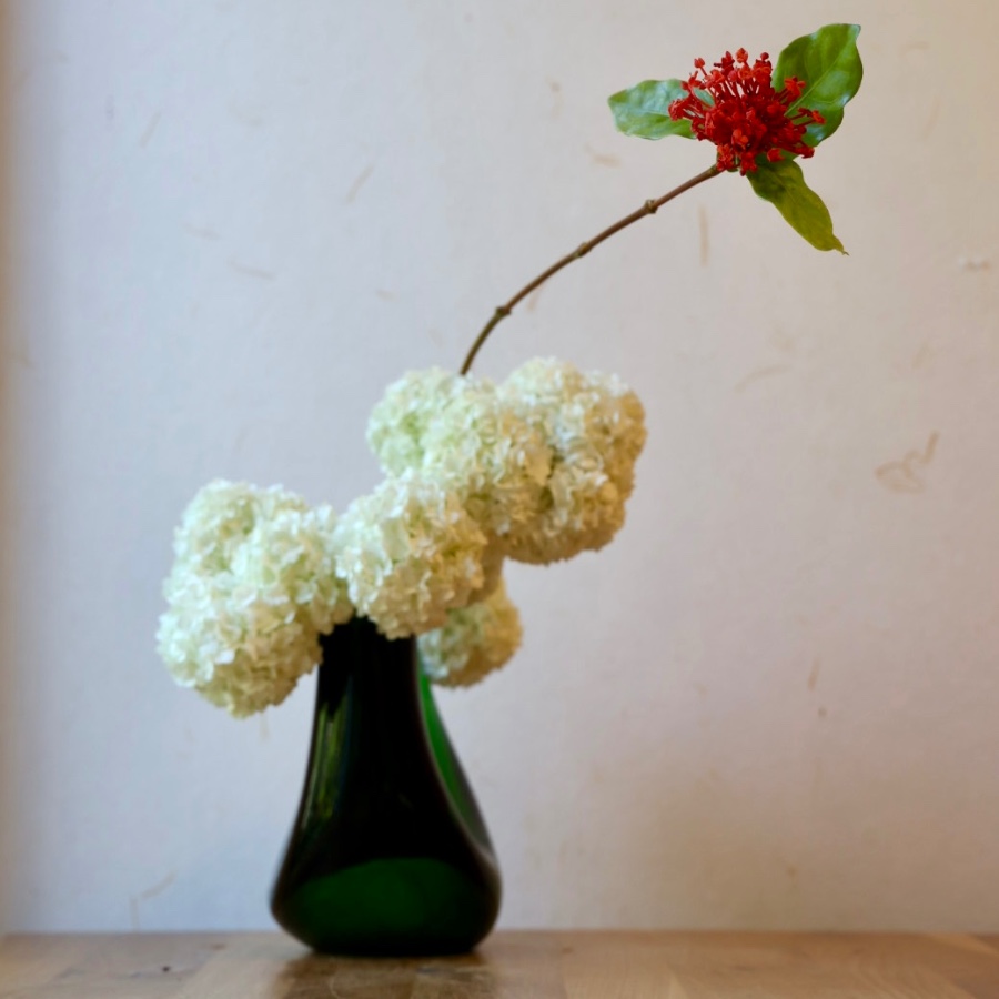 紫陽花の塊と、花器のフォルムをいかしていける。