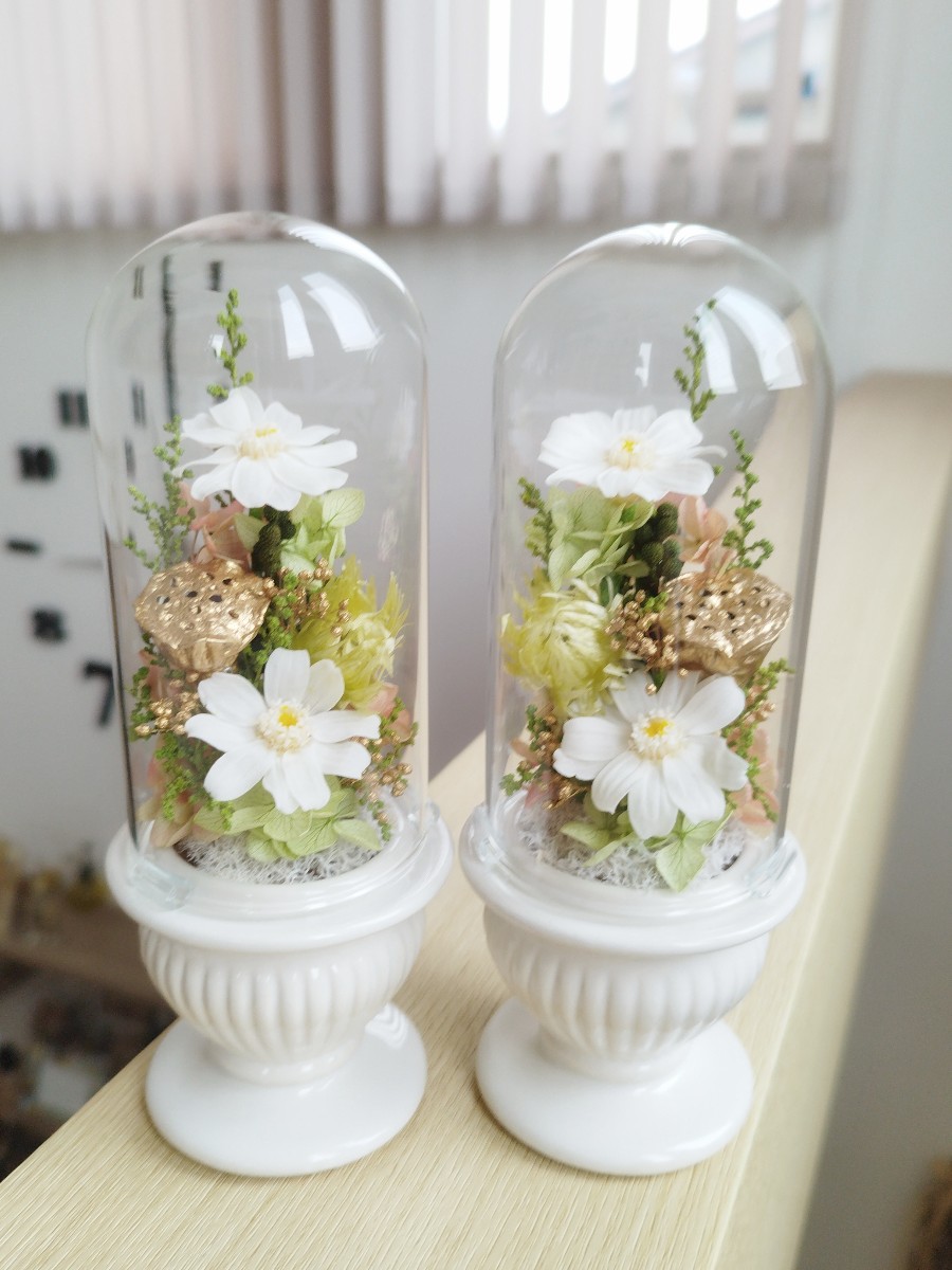 そんなお悩みも解決してくれる、プリザーブドフラワーの仏花。こちらはガラスドームに入ったアレンジなので、埃も付着せず、より長持ちします。