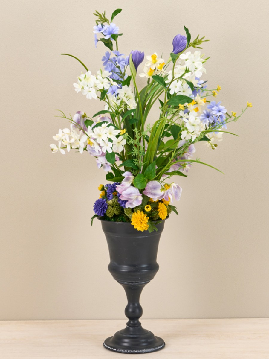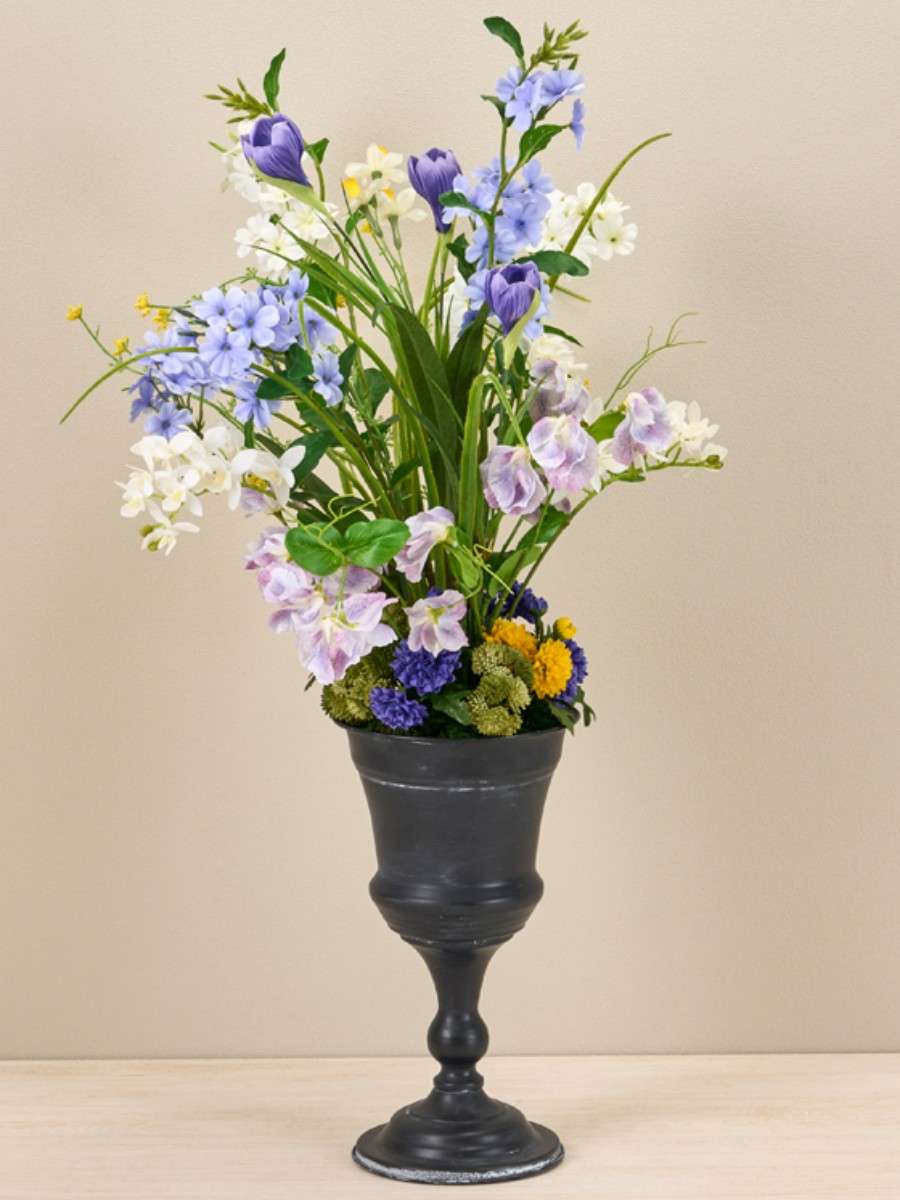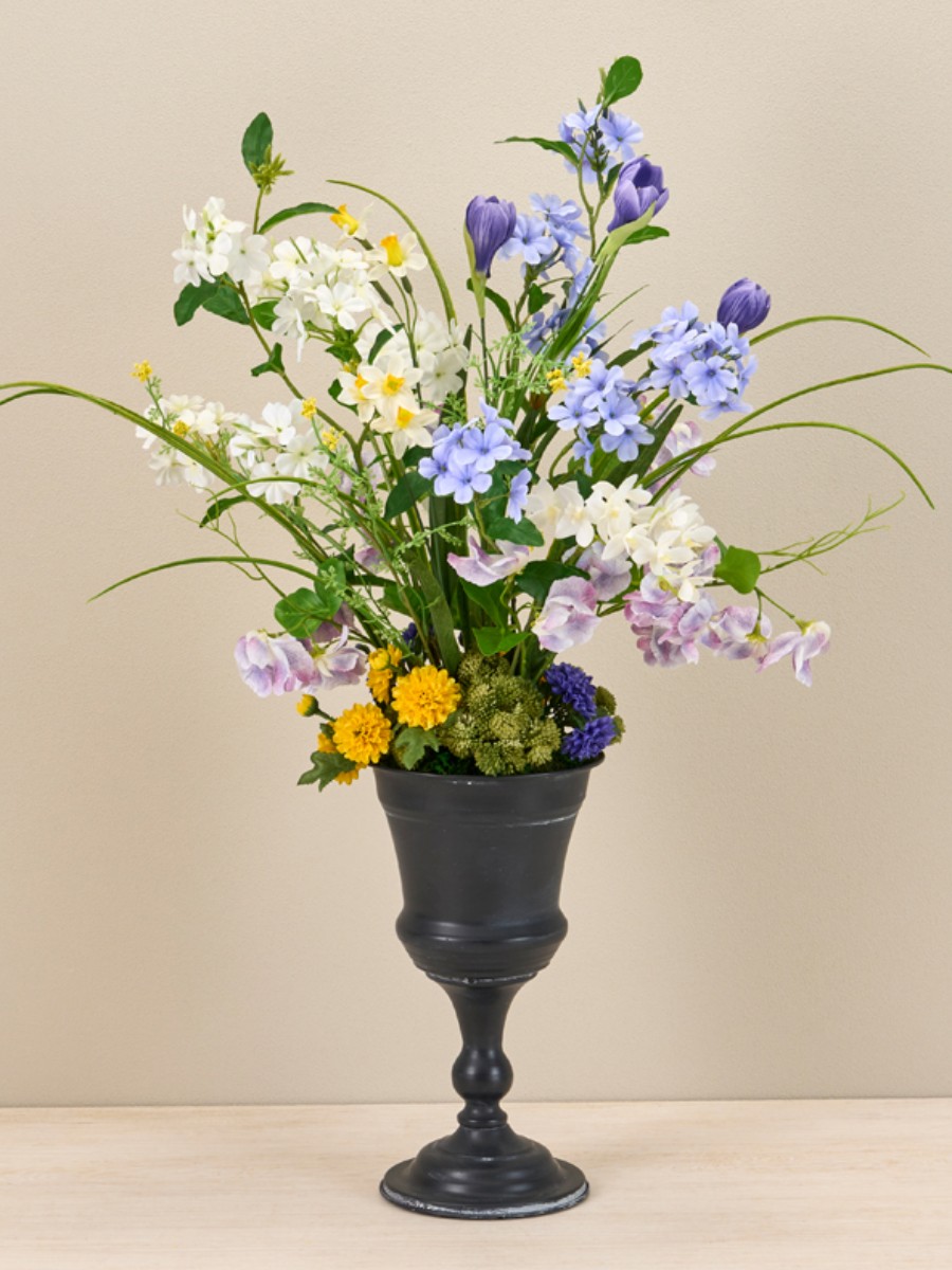 自然な流れを意識して花材を挿し、足元は面積の大きい花で埋めるように挿しました。