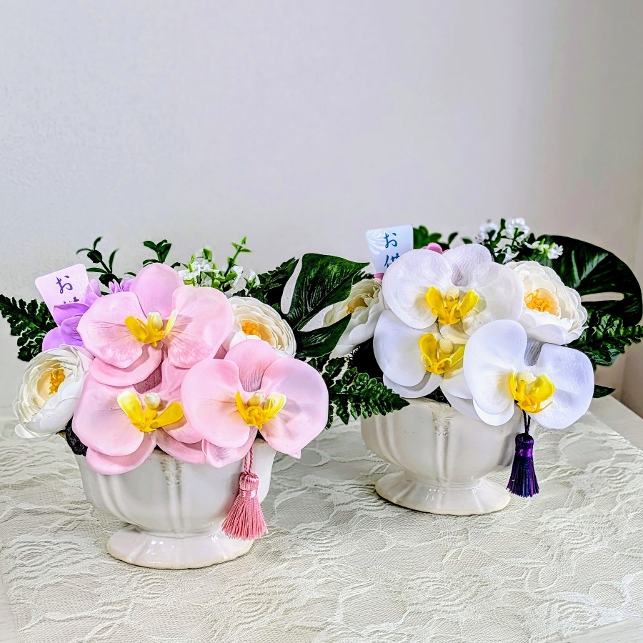 ほんのり香りがするソープフラワー仏花胡蝶蘭です。