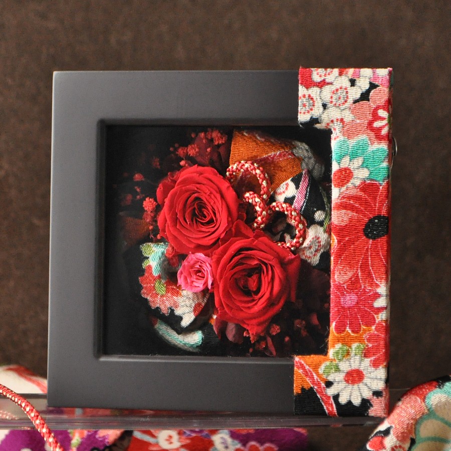 バラとちりめん生地で、和洋折衷デザインのフレームアレンジです。