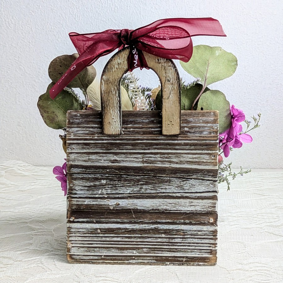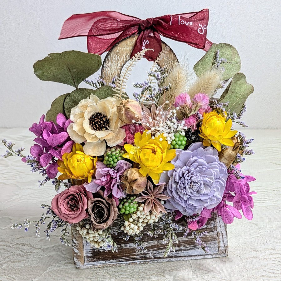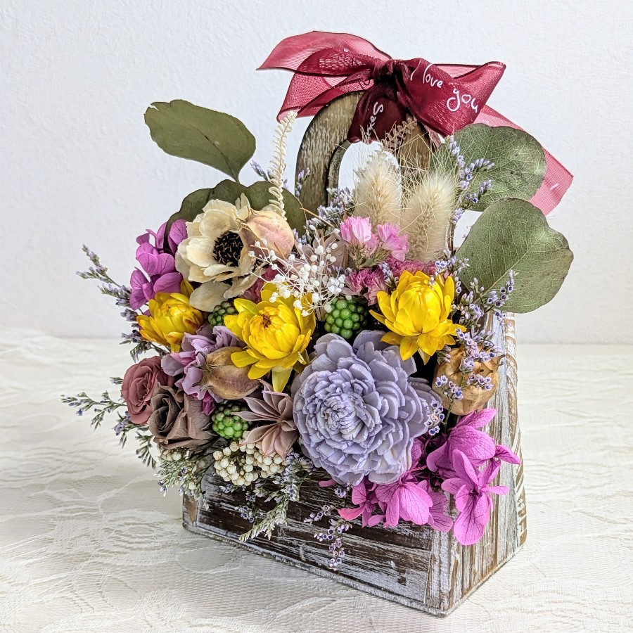 かばんの様な木製花器にプリザーブドフラワーやドライフラワーを使って作成したアレンジメントです。