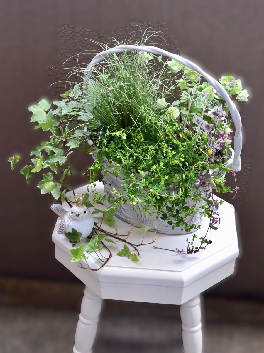 オレガノケントビューティー・カレックスアマゾンミスト・アイビー・ゴールドダスト・ピンクハートカヅラを寄せ植えしました。