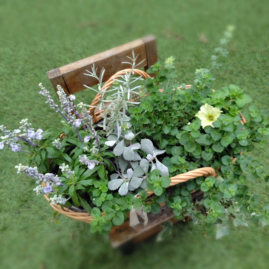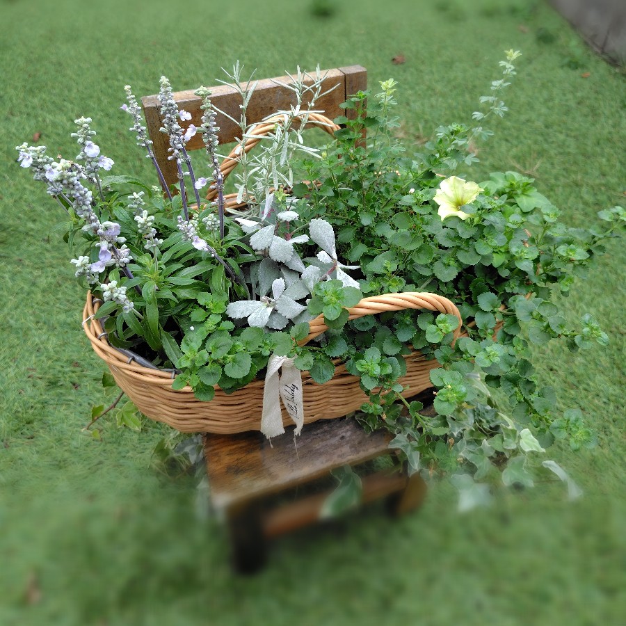 お洒落さを増す、籐のバスケットの寄せ植え。
