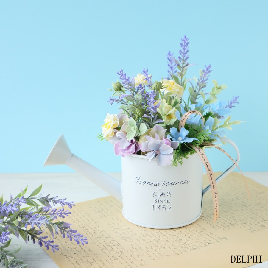 初夏の訪れを感じさせるラベンダーやマトリカリア、紫陽花などの小花を寄せ植え風にしたブリキジョウロのアレンジメントです。