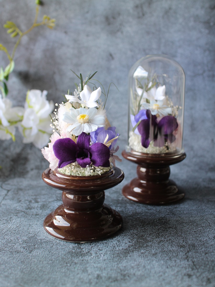 透明感あるガラスドームがお花を埃などから守ってくれ、生花がもたないこの季節には特におすすめです!