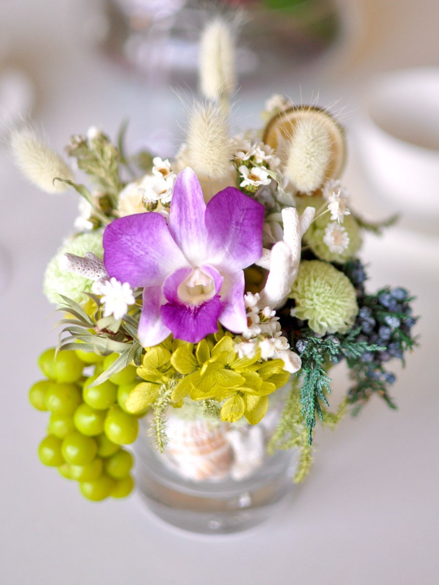サンゴや貝殻を敷き詰めたグラスにフォームをセットして、たっぷりのグリーンに小花やバラ、デンファレをあしらった夏らしいアレンジメントです。