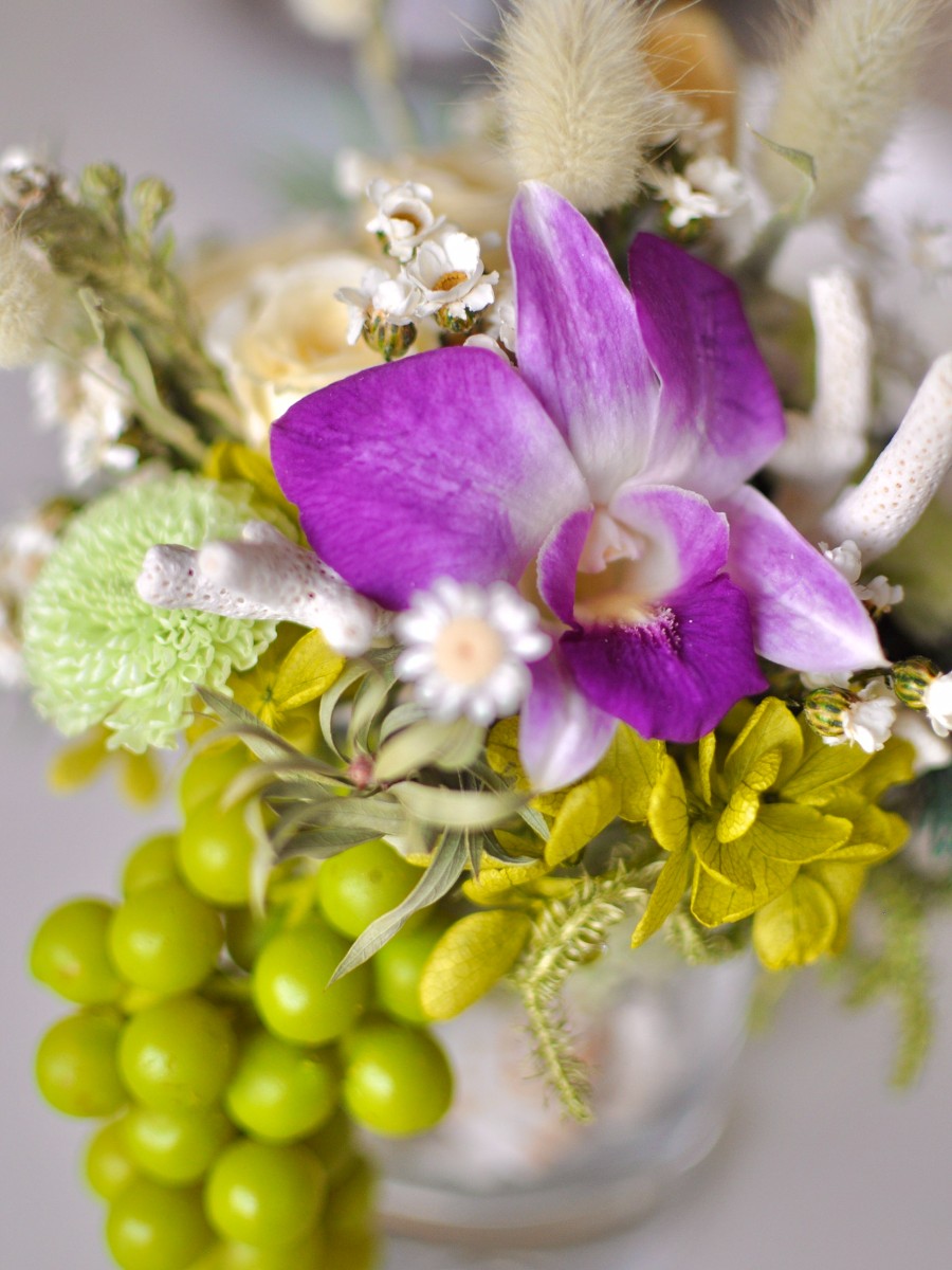 グラスからお花や葉っぱ、実ものが溢れるようにアレンジしました。