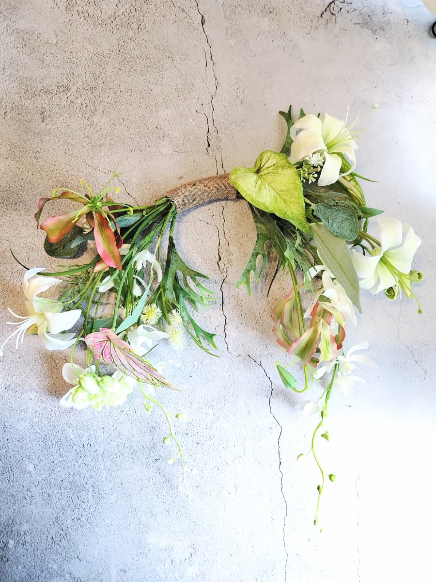 グリーン系のグロリオサや、シンビジュームなどトロピカルなお花や、ビカクシダとカラジュームをグリーンに使用しています。