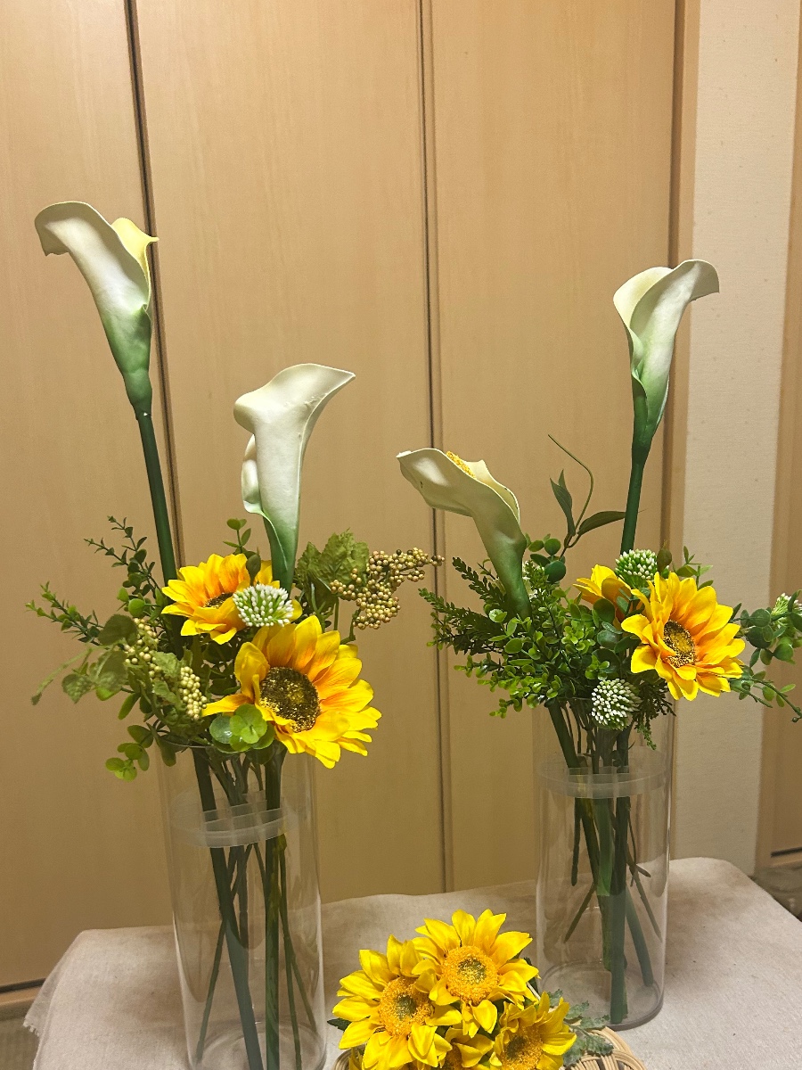 クリアの花器とひまわりで夏らしさをたっぷりと感じていただける仕上がり。仕上がり後は贈り物にされるとの事。