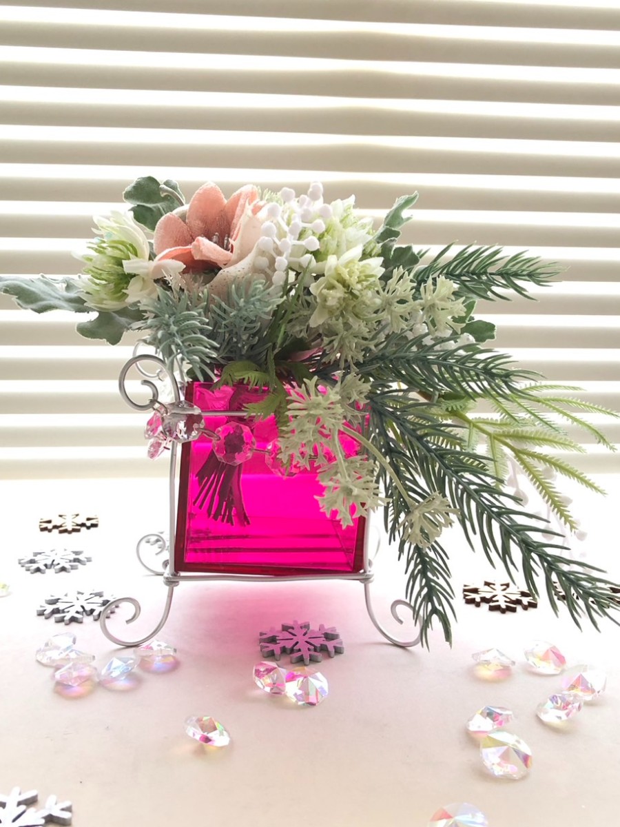 キューブ型のケースに、ワイヤーのスタンドで高さを出し、小さなキャスケードブーケのようなアレンジを添えて飾りました。