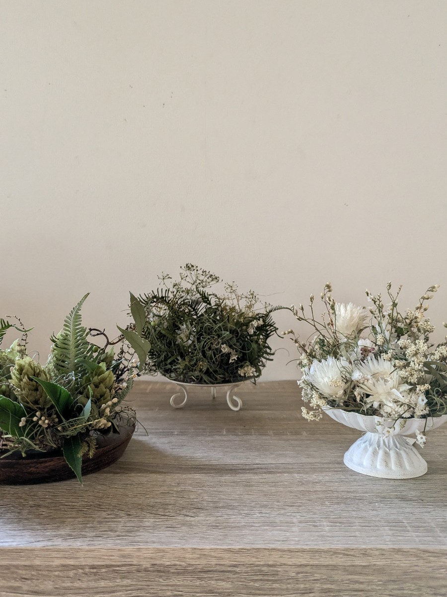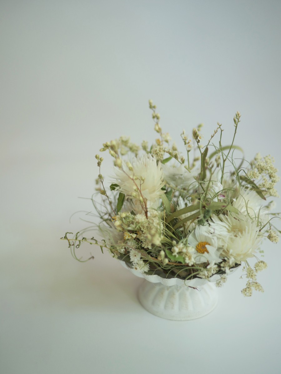 リースやブーケの中にストーリー性があり、草花が風にゆれる自然の景色をそのまま切り取ったかのような作品づくりをしています。