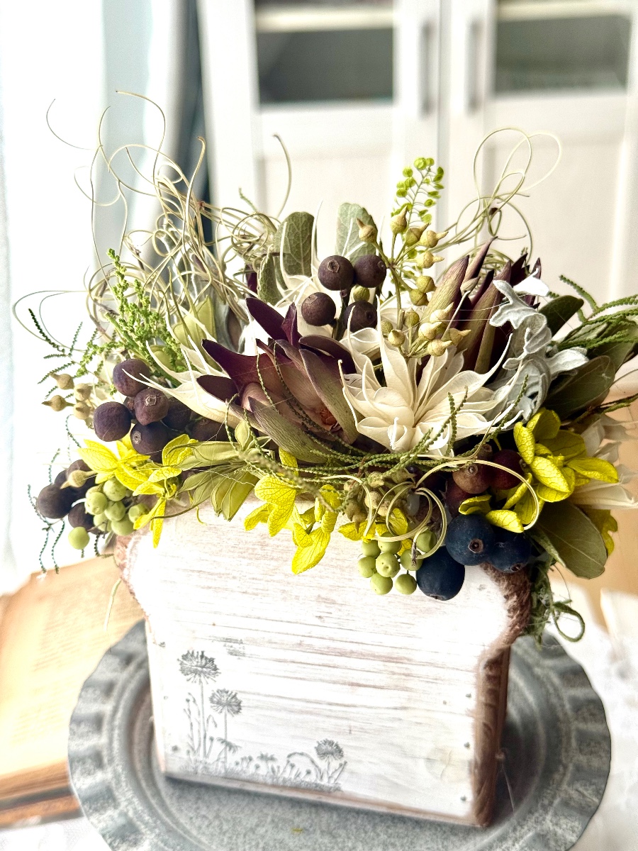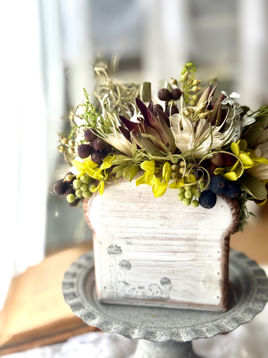 可愛い食パン型の入れ物に、ボタニカルな花材をふんだんにアレンジしました。プリザーブドのアジサイをアクセントに長く飾っていただけます。