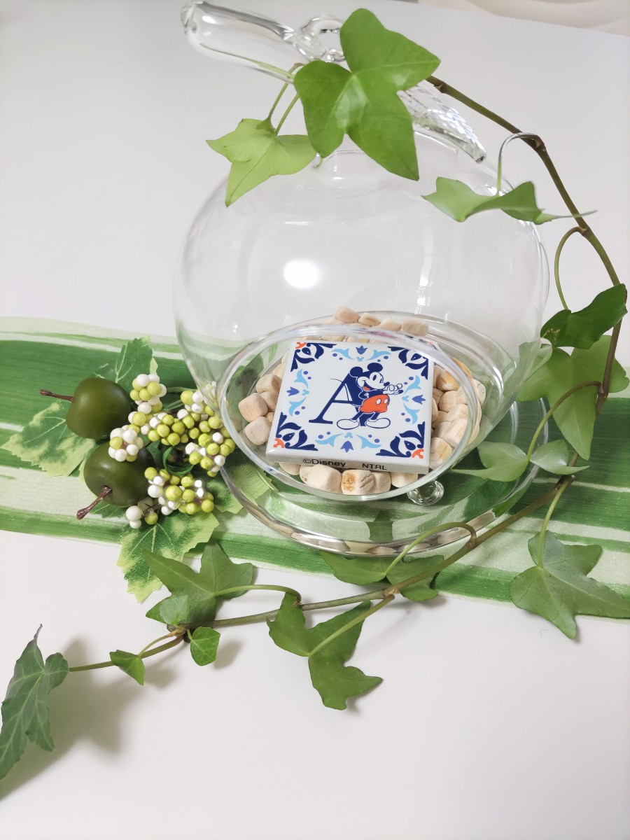 リンゴの形のハンギンググラスにひのき粒と小さなタイルを入れて、アイビーを添えました。ひのきの香りが心地良くてリラックス出来るアイテムです。