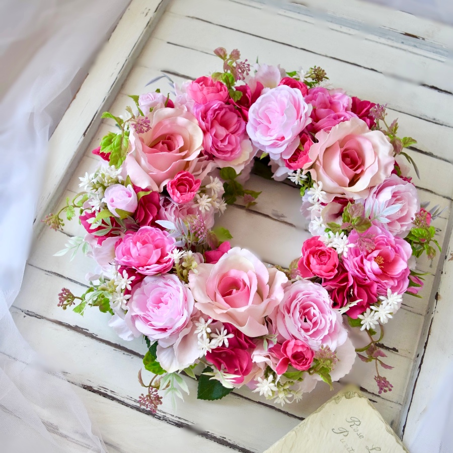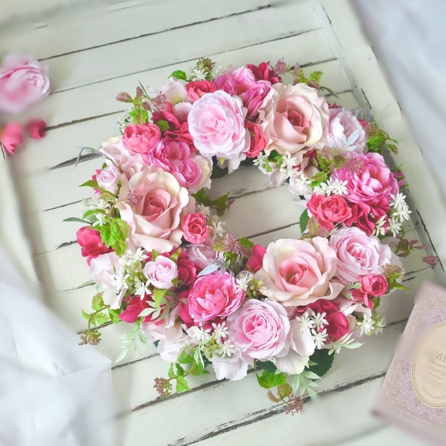 お誕生日プレゼントにとオーダーをいただき、華やかなピンクのバラいっぱいでエレガントに仕上げました。