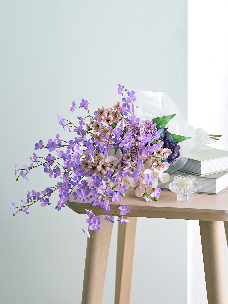 スプレー状のミニフラワーがふわりとした印象の花束。ベージュトーンの上に淡いパープルカラーが被さる様にかかり、優しくエアリーな印象。首元は濃いパープルのハイドランジアのアクセントを入れ、小花の優しさをより生かします。