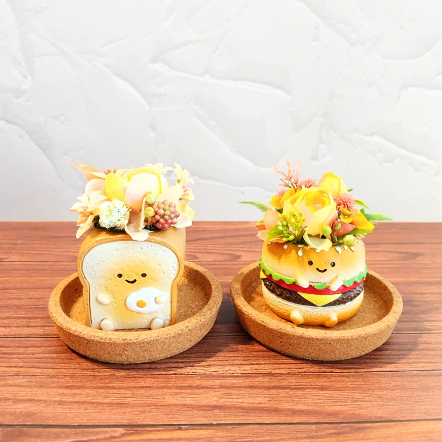 野菜やチーズの入ったハンバーガーちゃんの可愛らしい器にアーティフィシャルフラワーをあしらいました。