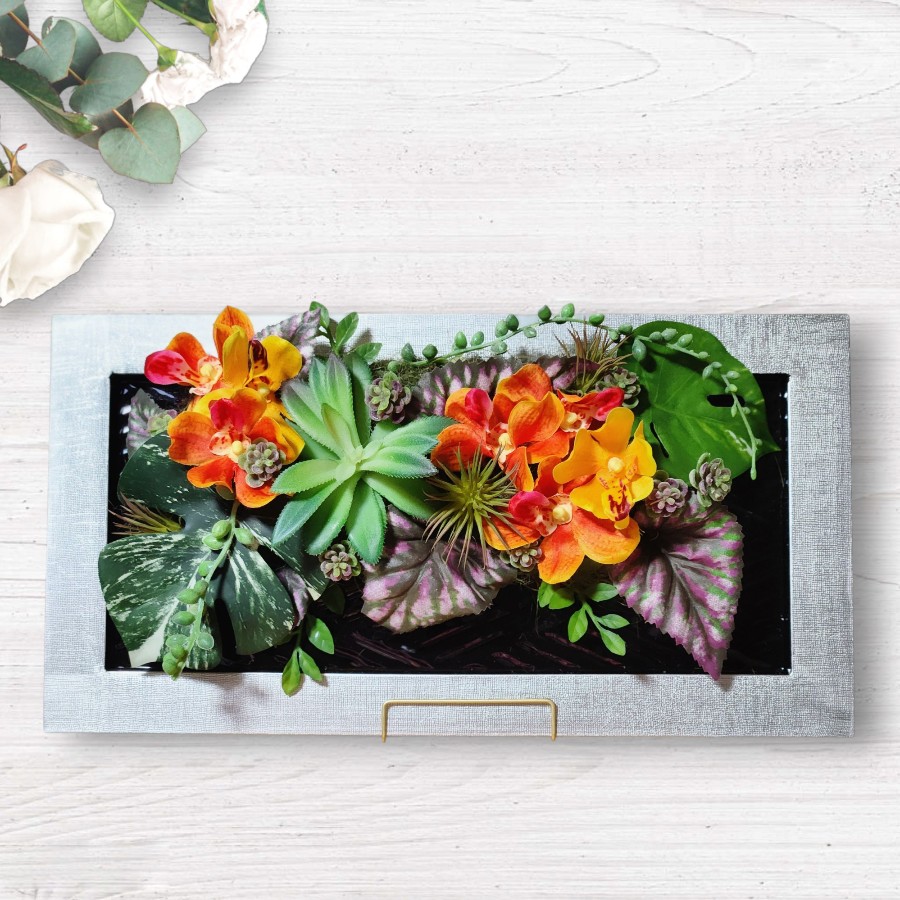多肉植物とオレンジ系の花を使って
