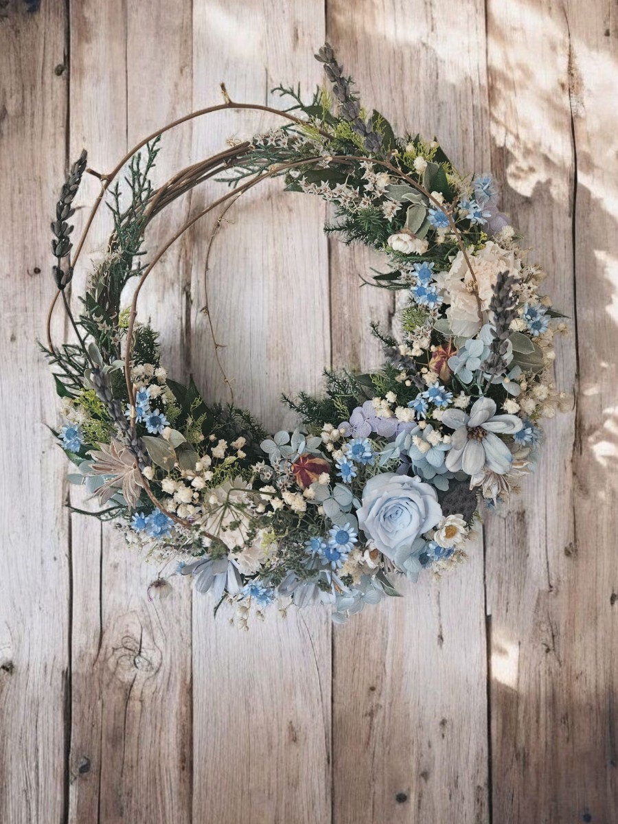 ラフに編んだベースに、プリザーブドグリーンと白~パステルブルーのお花をたっぷり、ふんわりあしらった三日月リースです。