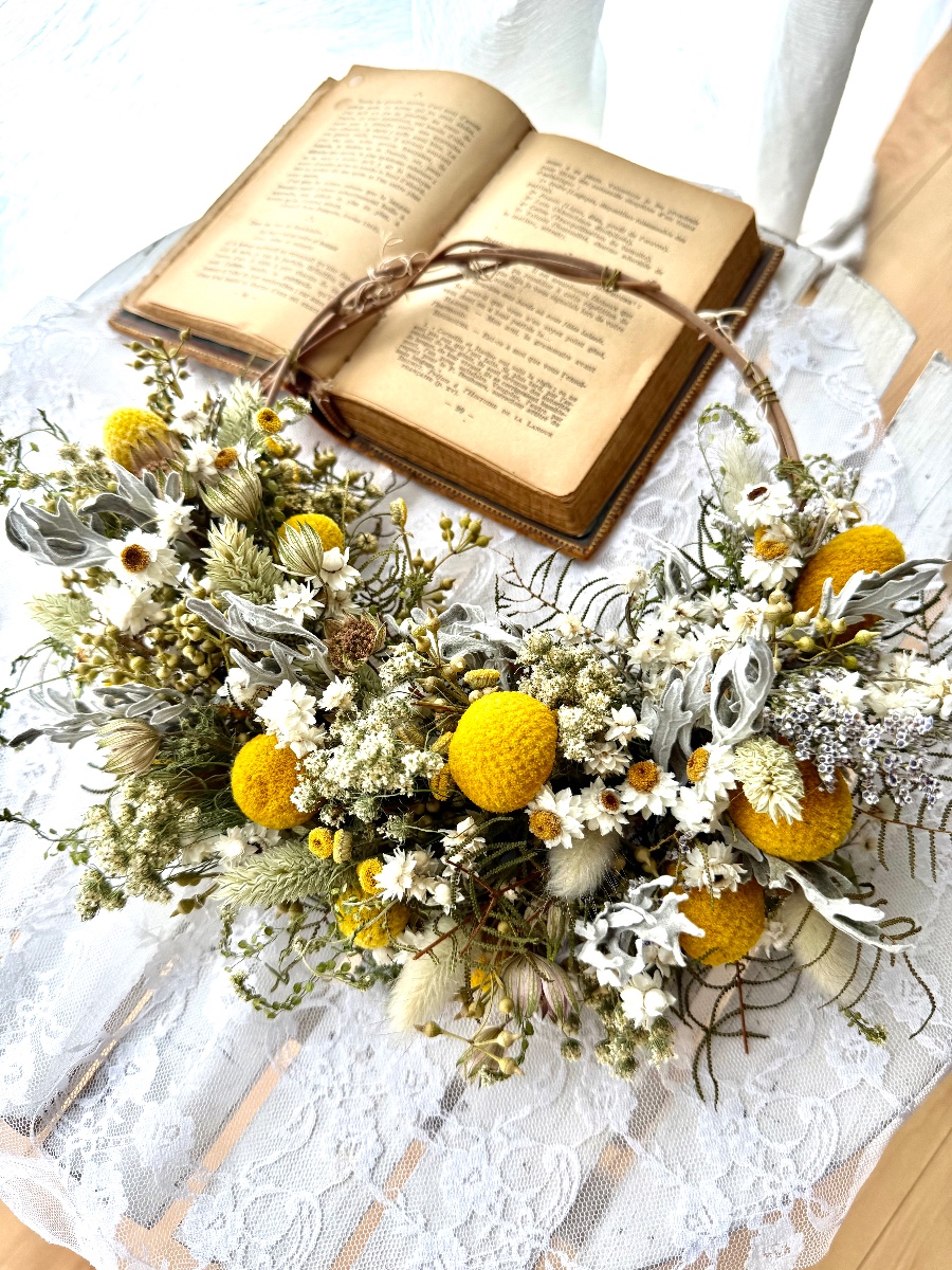 黄色のビリーボタンをアクセントに、緑色のドライフラワーをふんだんに使用したハーフリース。リースワイヤーを使うと簡単にリースに花材を巻きつけられます。夏らしいナチュラルなハーフリース。