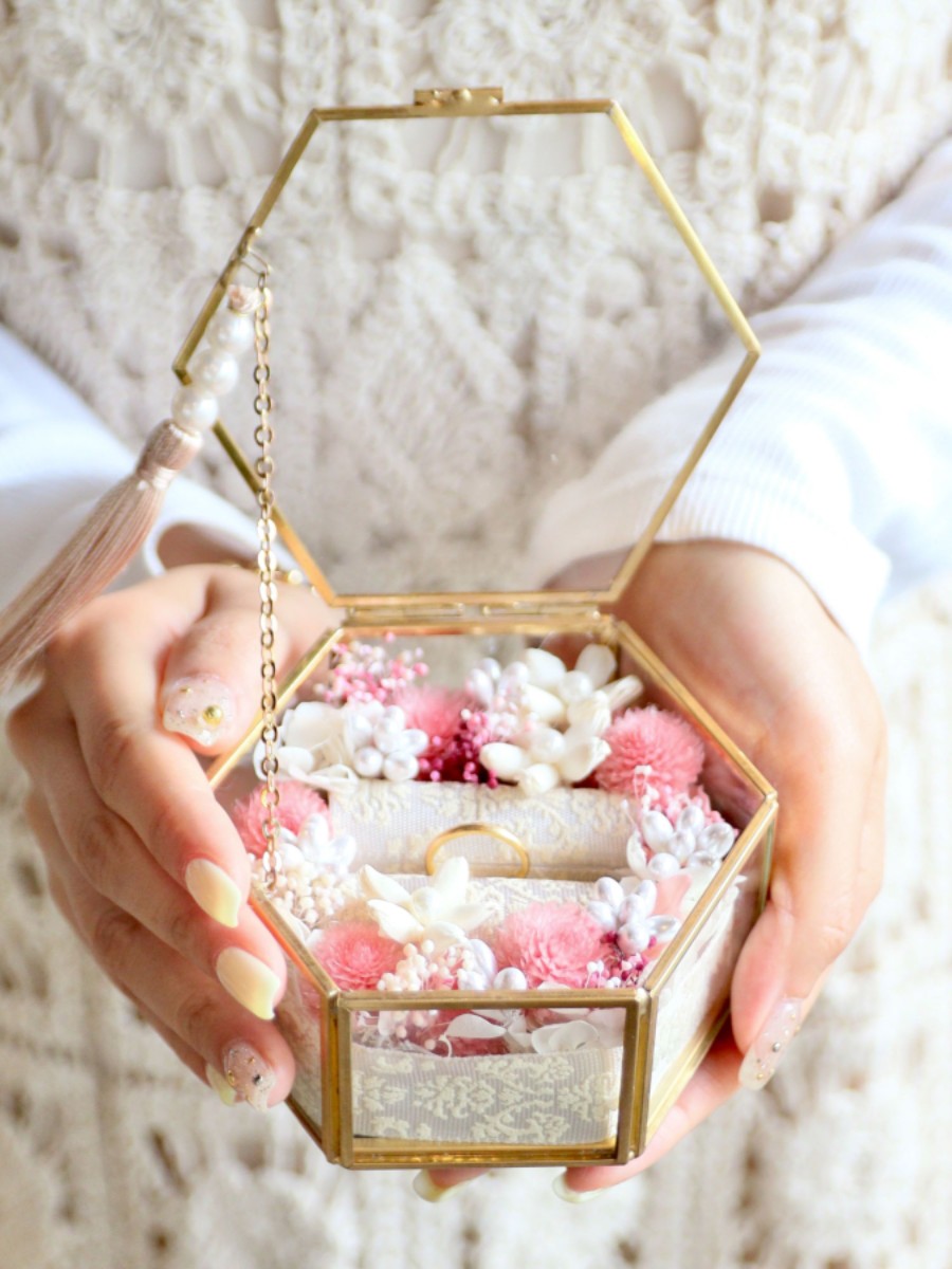 この作品は、結婚式や記念日の象徴である「リングピロー」を、六角形のガラスケースと繊細な花材でロマンティックに仕上げたデザインです。プリザーブドフラワーやドライフラワーを用いたアレンジメントは、記憶に残る特別な瞬間を“永遠に閉じ込めた”ような魅力を持っています。