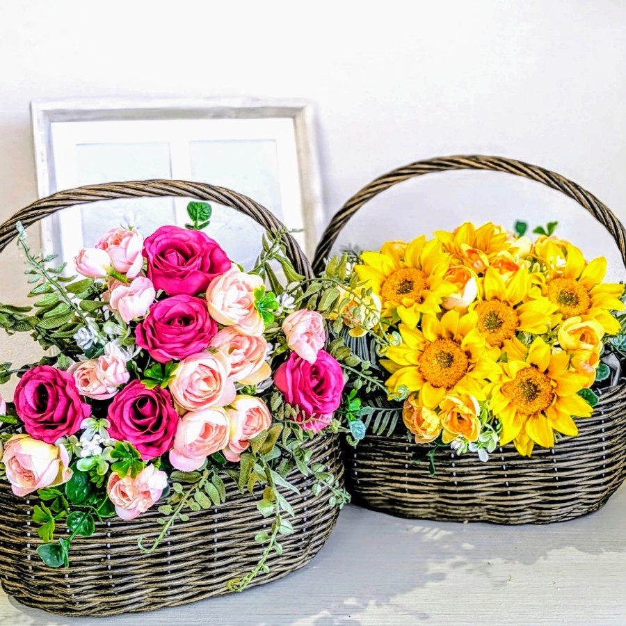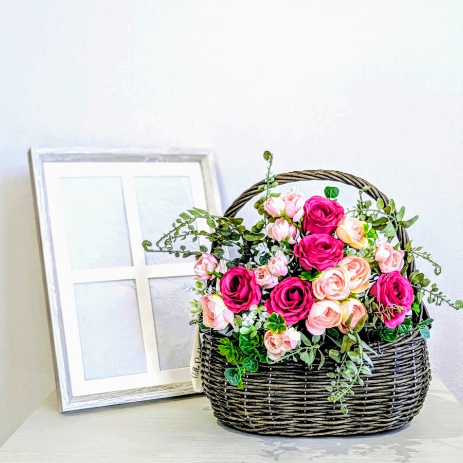 アーティフィシャルフラワーローズとラナンキュラスのブーケバスケット入です。