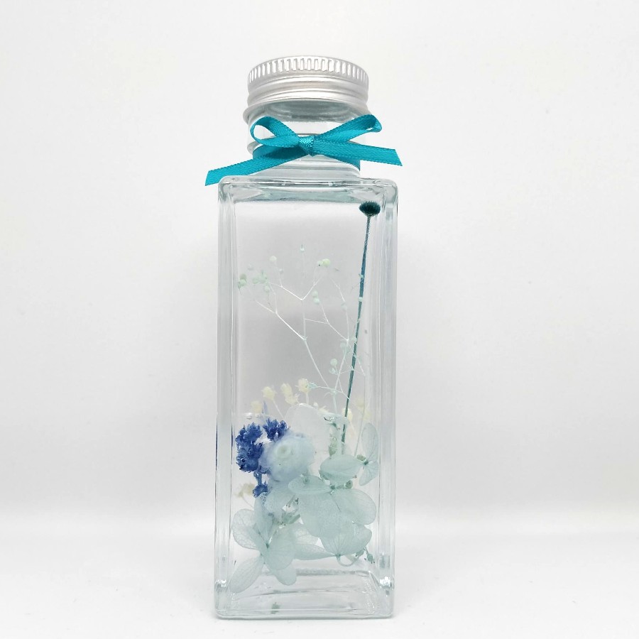紫陽花、かすみ草、ピンキーボタン、イモーテル、クリスパムを100mlの角瓶に詰めてハーバリウムにしました✰