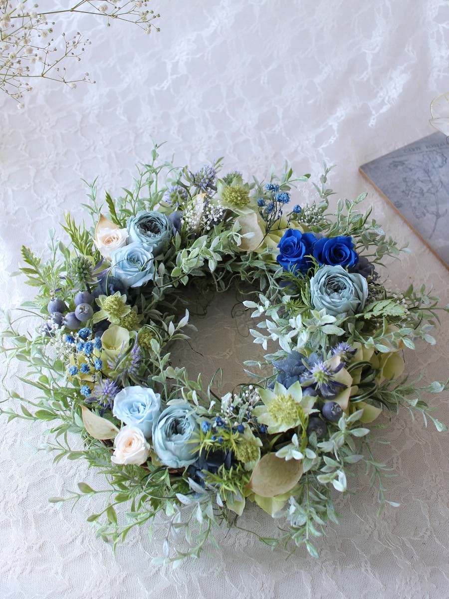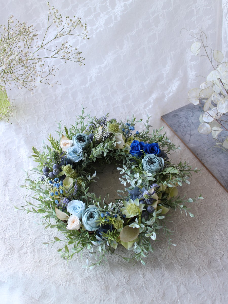 爽やかなブルーを基調に、プリザーブドとアーティフィシャルを織り交ぜて、丁寧に仕上げたリースです。