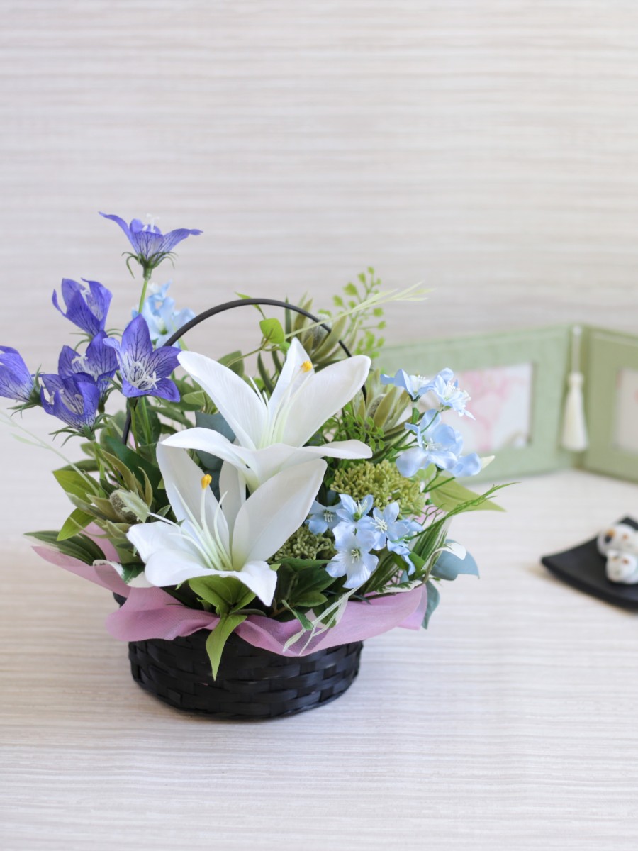 ゆり、ききょうの上品な白と紫の組み合わせに水色のデルフィニウムあしらって柔らかく優しい雰囲気に仕上げました。