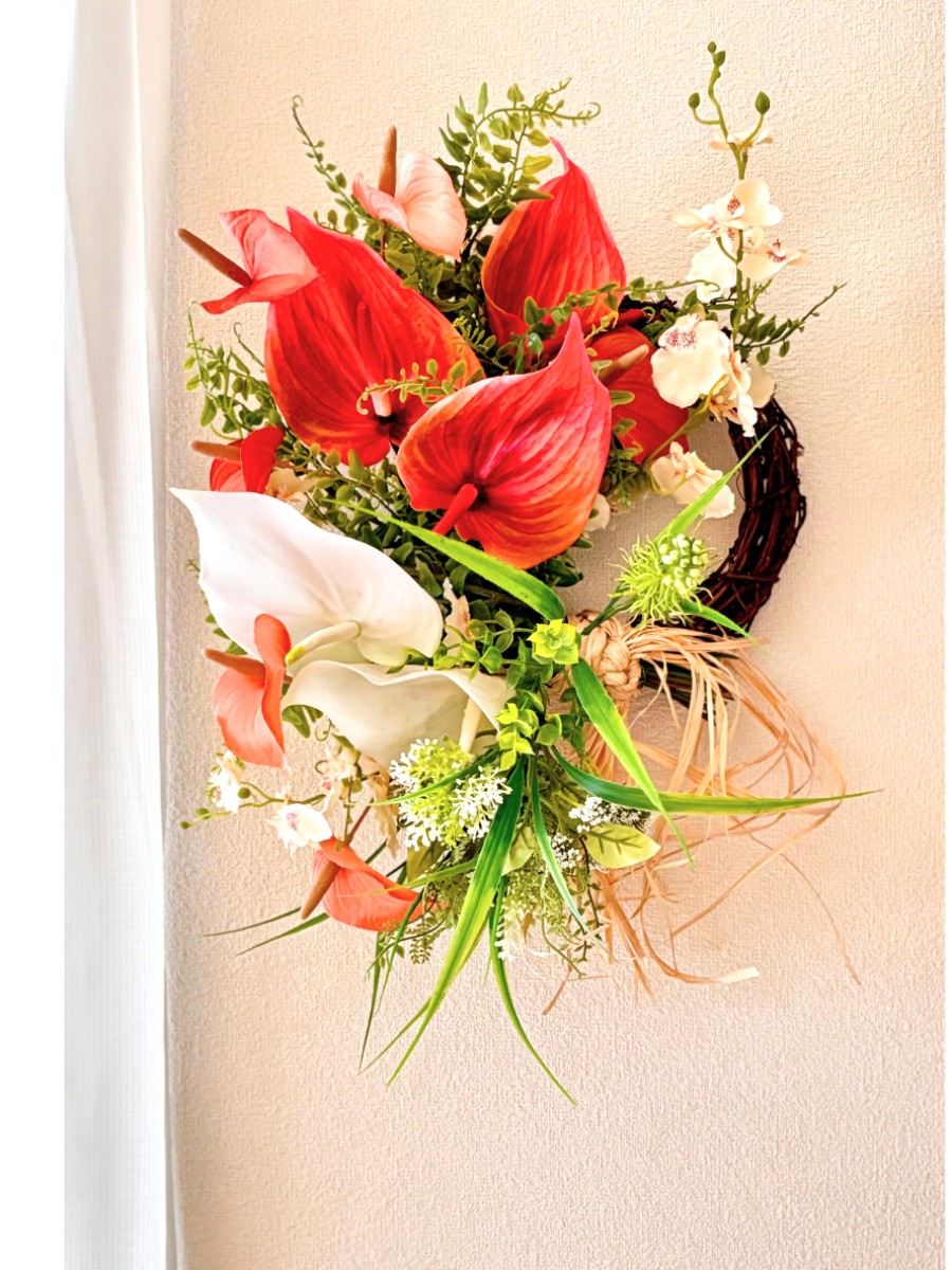 サイズ感のある花材をメインに華やかなアートの飾りに