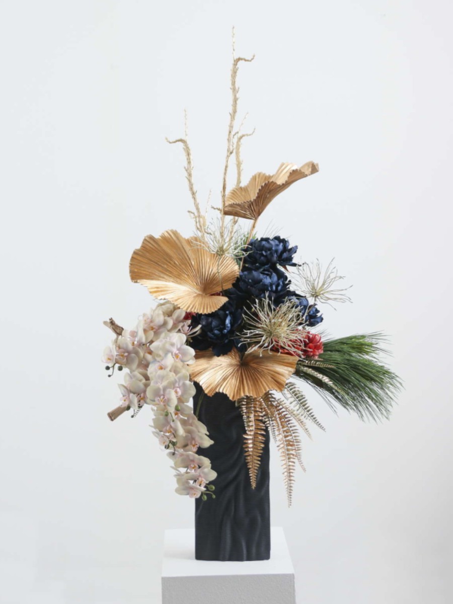 ゴールドのリーフと深いネイビーの花々が織りなす、上品でモダンな正月アレンジメント。