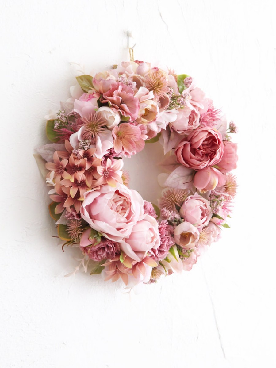 ふんわりと咲き誇る4種の薔薇やアジサイ、カーネーションなど、さまざまな花々をピンクトーンでまとめた華やかで優しいリースです。