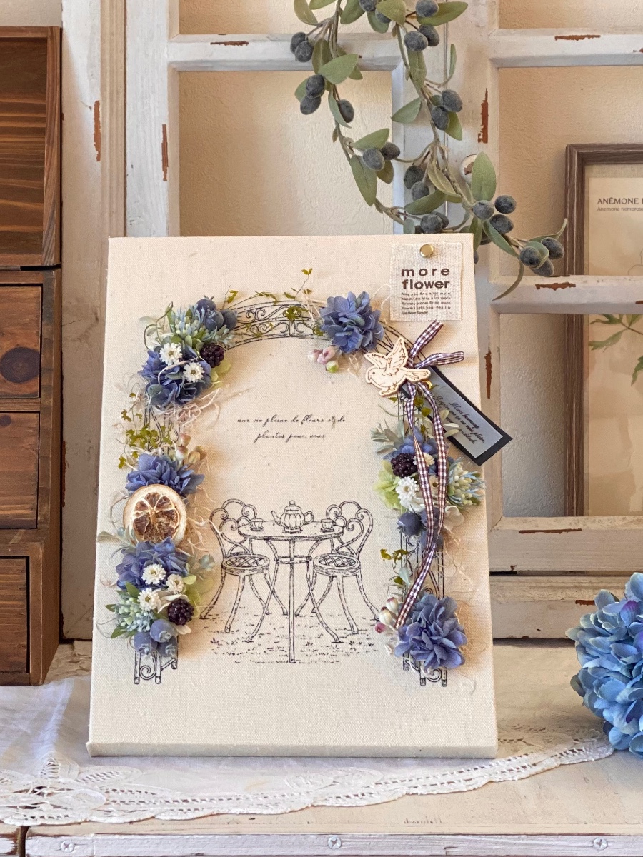 イラストがプリントされているキャンバスボードを使ったアレンジです。