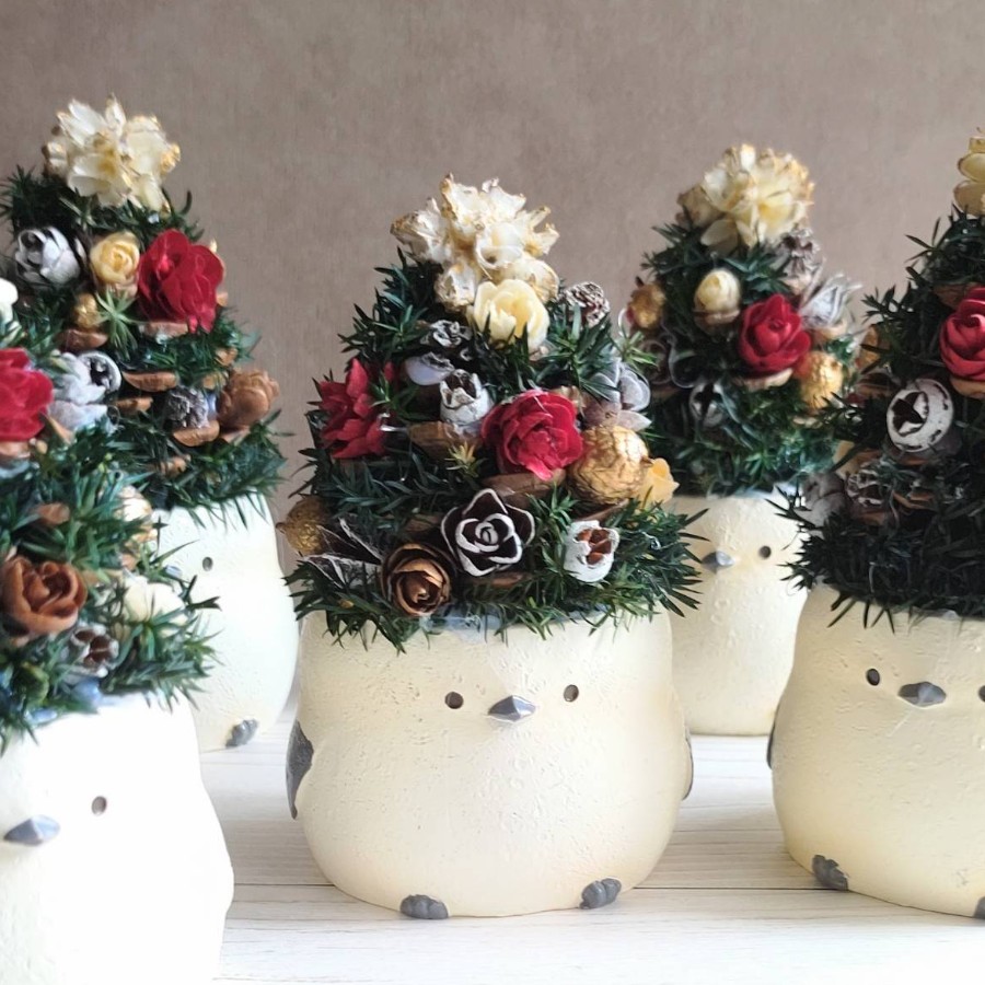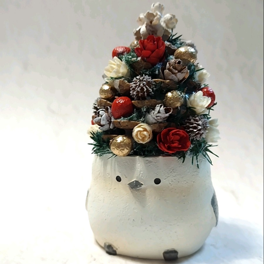 北海道にしか生息しない野鳥のシマエナガ…白いもふもふにつぶらな目。可愛らしい姿がとても人気です。こちらは手のひらサイズのシマエナガのレジンポットに松ぼっくりを乗せ小さな木の実で飾ったぼっくりツリーです。秋からクリスマスの時季にイベントやハンドメイドマルシェ、委託先でもとても人気のあるフラワーインテリアです。