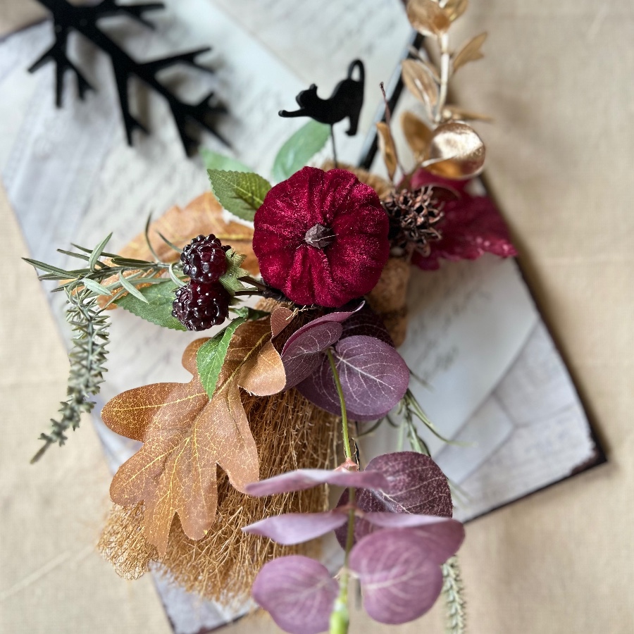 バーガンディ色のパンプキンが新鮮で少し大人っぽいハロウィンアレンジです。