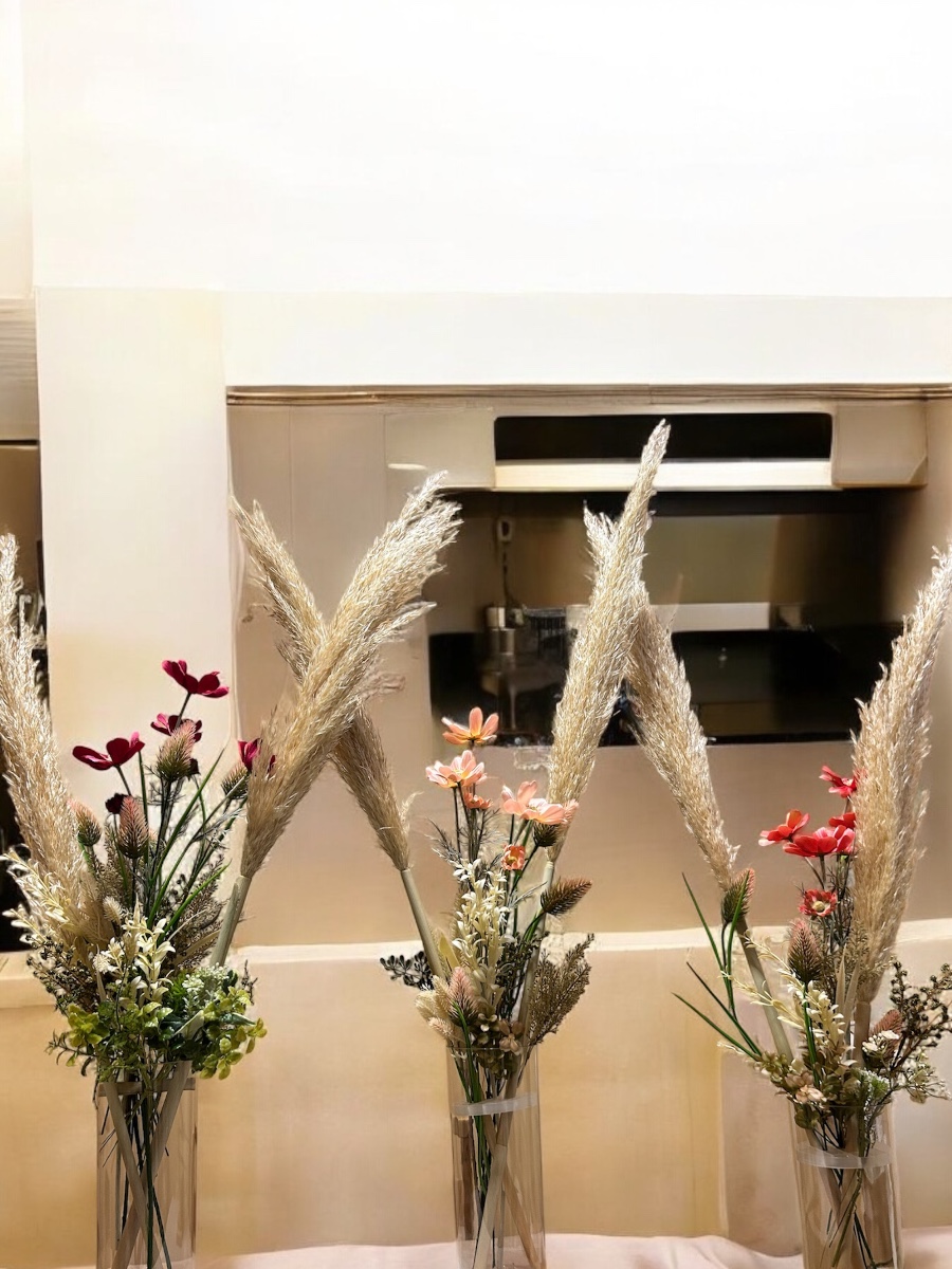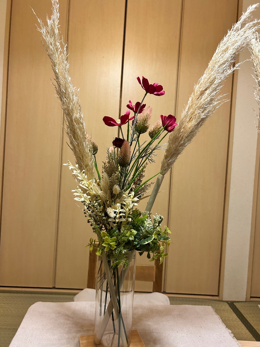 早生のパンパスグラスの変化を楽しみながら、アーティフィシャルフラワーとの組み合わせをお楽しみいただきました。