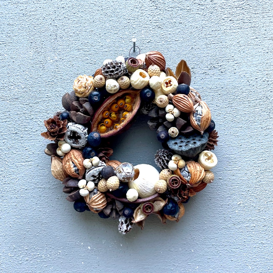 たくさんの木の実をぎゅっと詰め込んだ、手のひらサイズのナチュラルリースです。