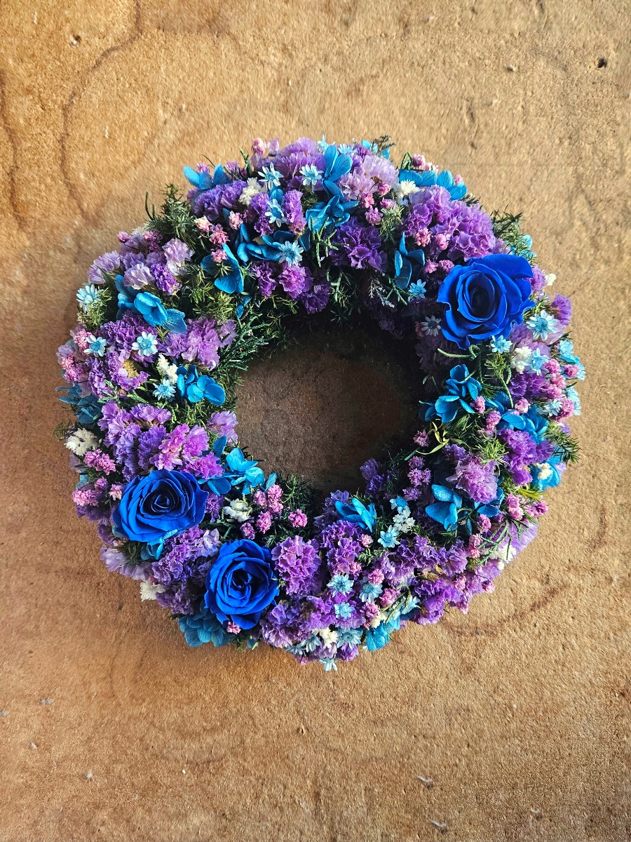 青と紫の花畑を眺めているような、鮮やかで優しい印象のドライリースです。
