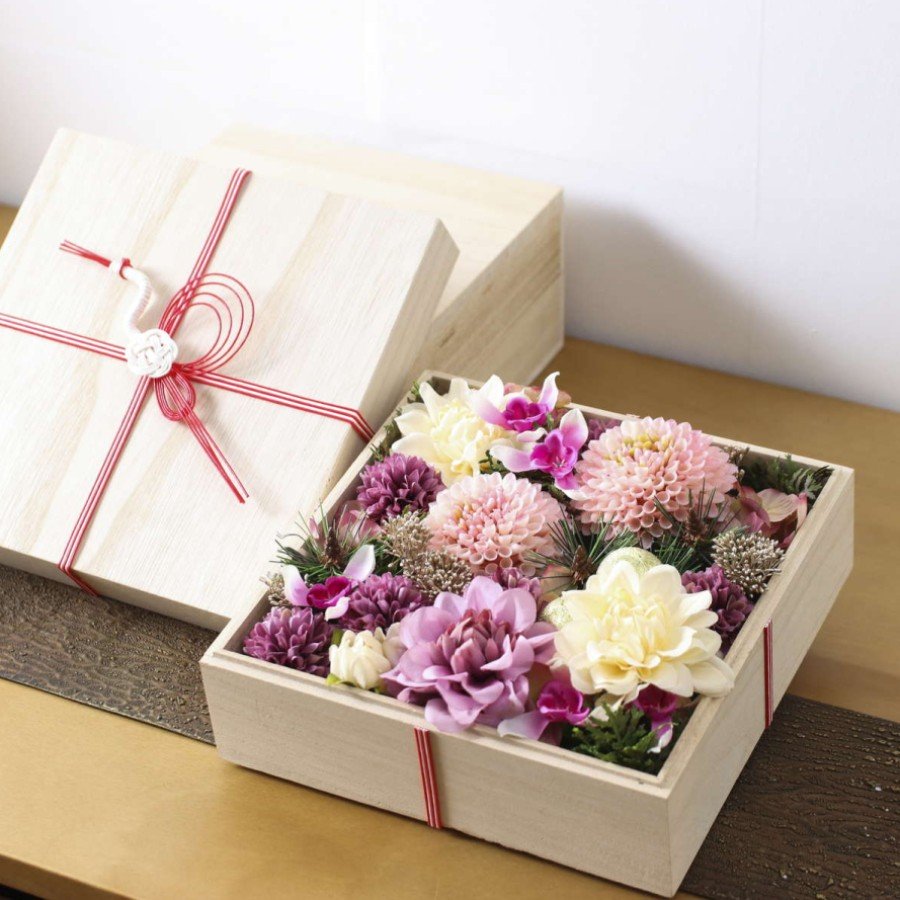 木箱の上質な風合いと水引飾りが、正月らしい格調高さを引き立てます。