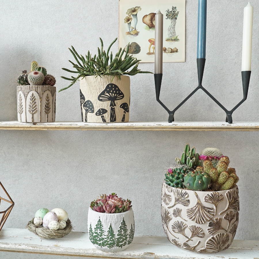 可愛い動物のオブジェをはじめ、アフリカンやエスニック系のかっこいい系、アラベスク柄やダマスク柄といったエレガント系のものまで、どなたでもお取り扱いいただけるように幅広いジャンルのデザインの鉢を数多く企画開発しております。