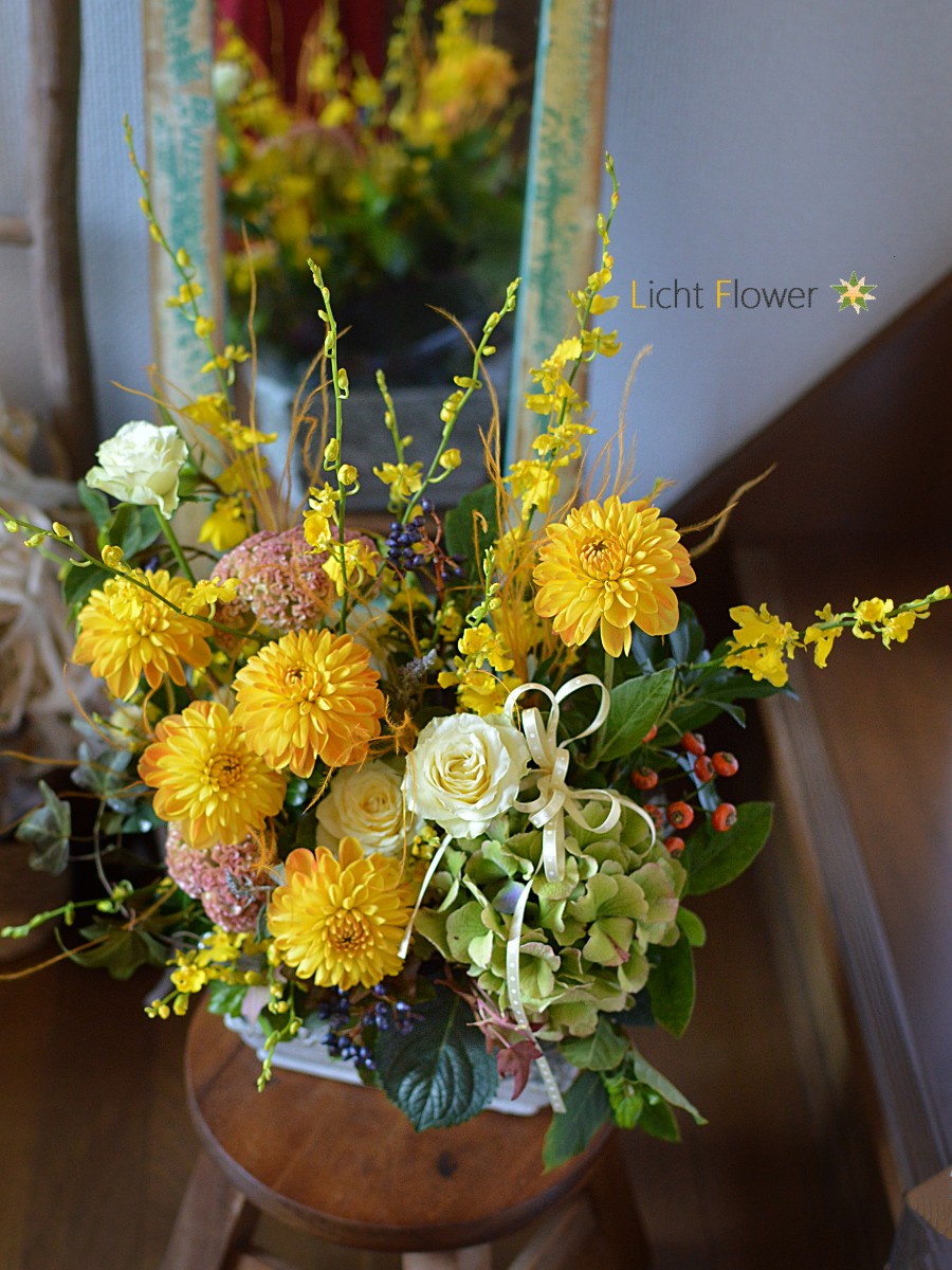 クラッシックなフラワーベースにアンティークなイメージでアレンジしました。