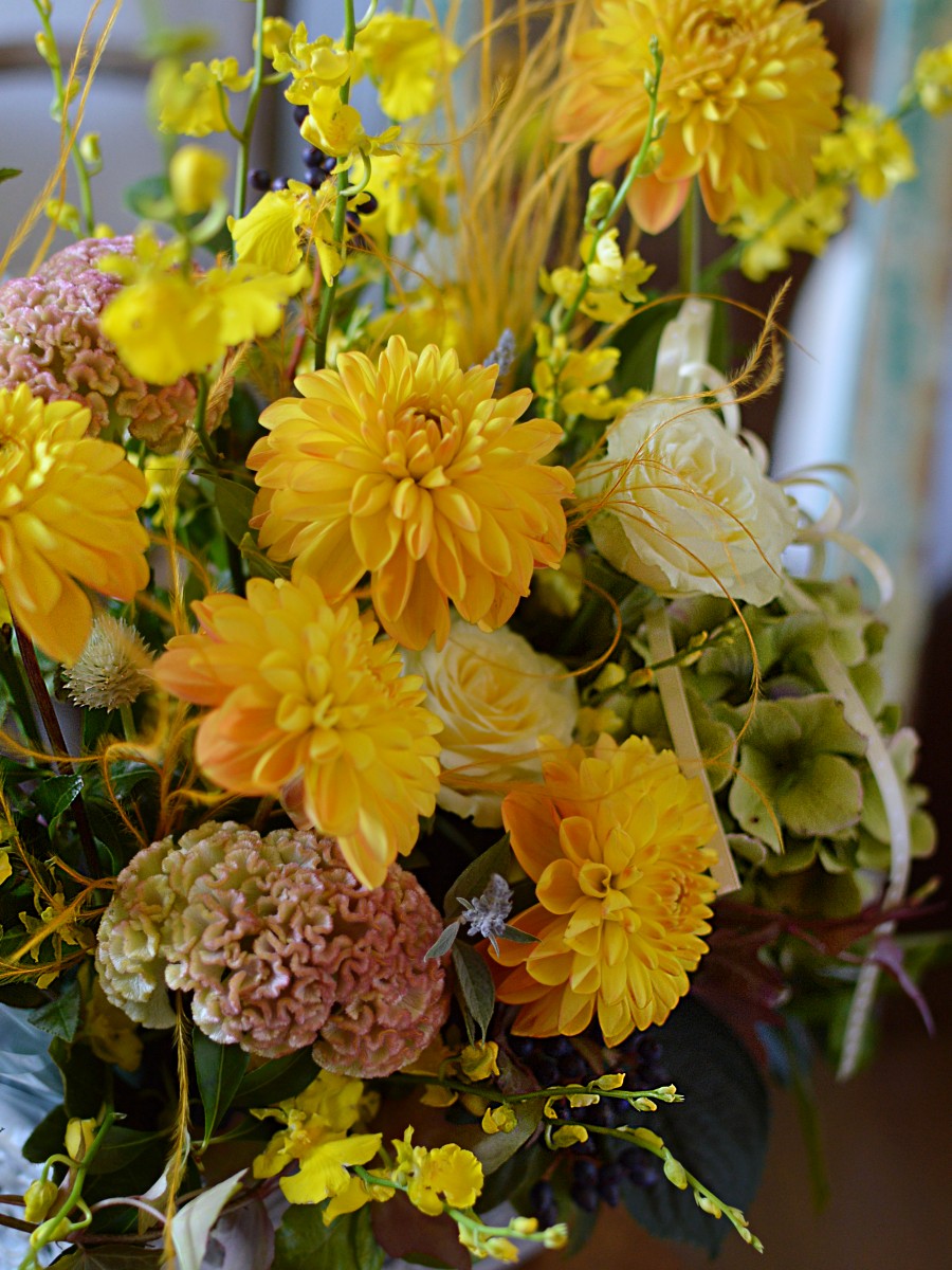 初秋に見頃を迎えるダリアと秋色アジサイや紅葉色のケイトウやアイビーが秋を感じさせてくれます。