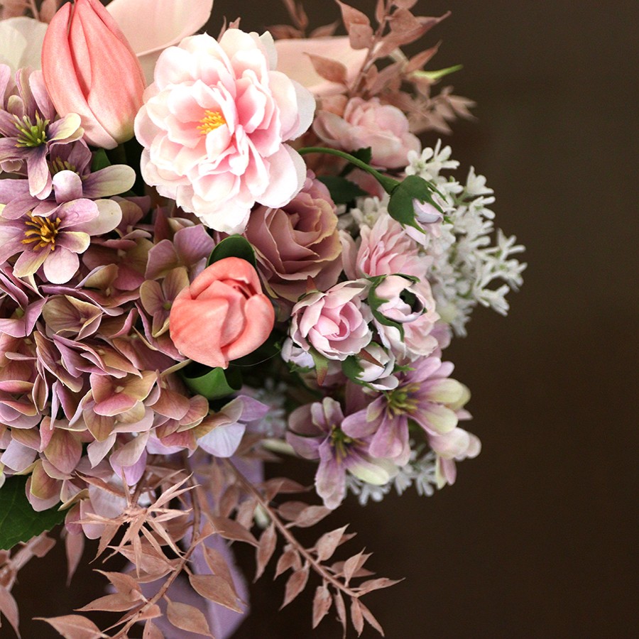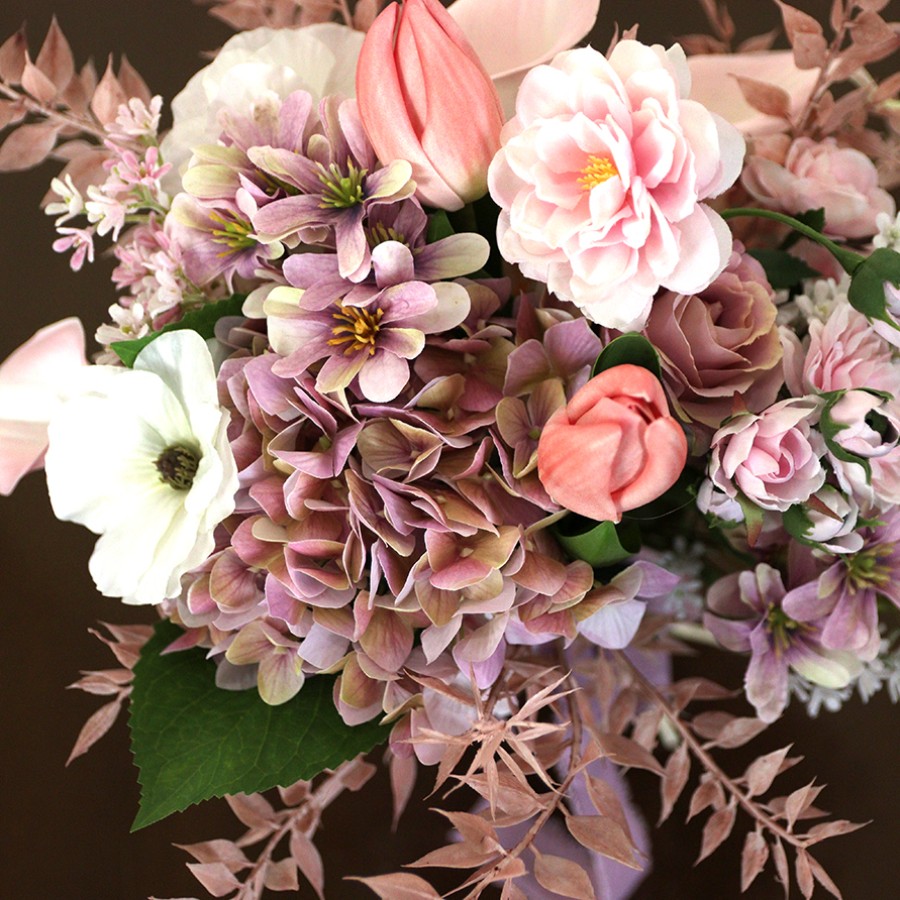 淡いピンクのチューリップやバラを中心に、アジサイや小花を組み合わせた可憐なブーケ。