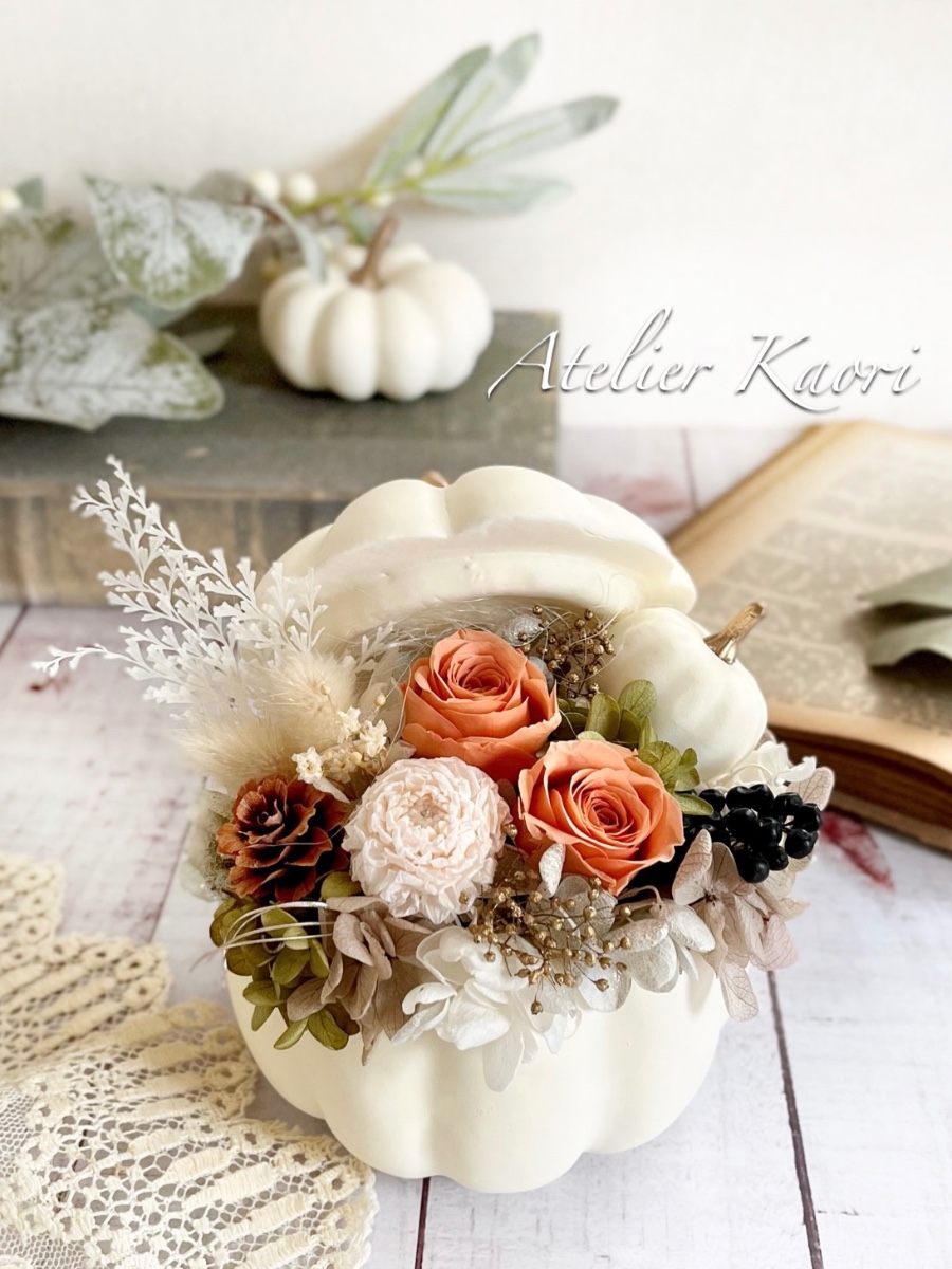 ホワイトパンプキンにタルトオレンジのローズ、柔らかなミニダリア、シックな色合いのアジサイを入れた上品な大人のハロウィンアレンジです。