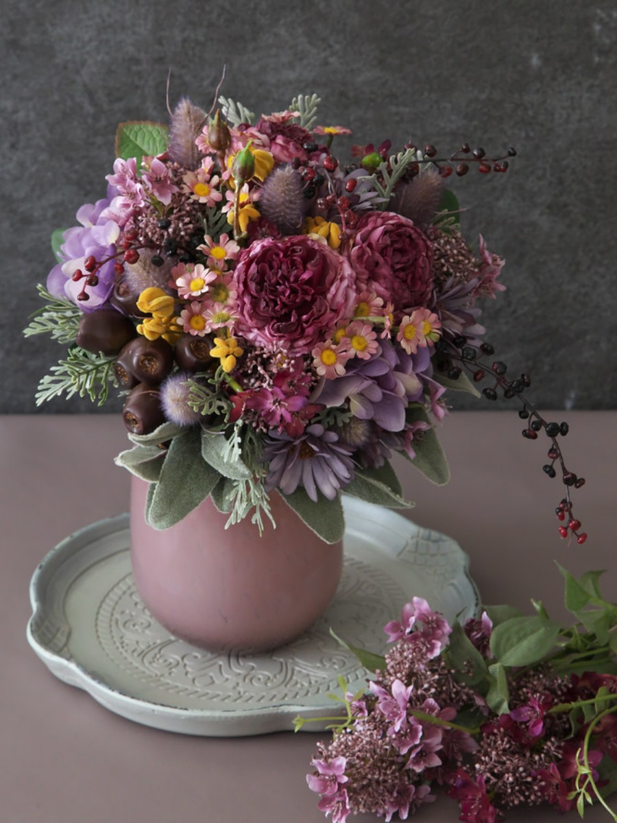 繊細な質感と深みのあるワイン・モーブトーンで仕立てた、絵画のようなアーティフィシャルフラワーブーケです。